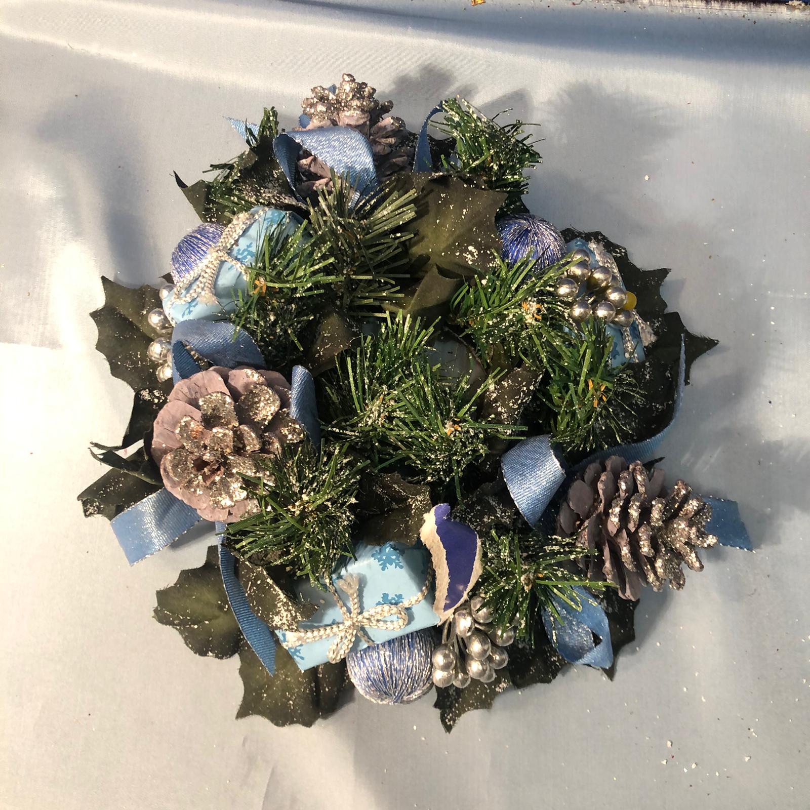 • Ghirlanda con pacchi blu e pigne colorate in argento