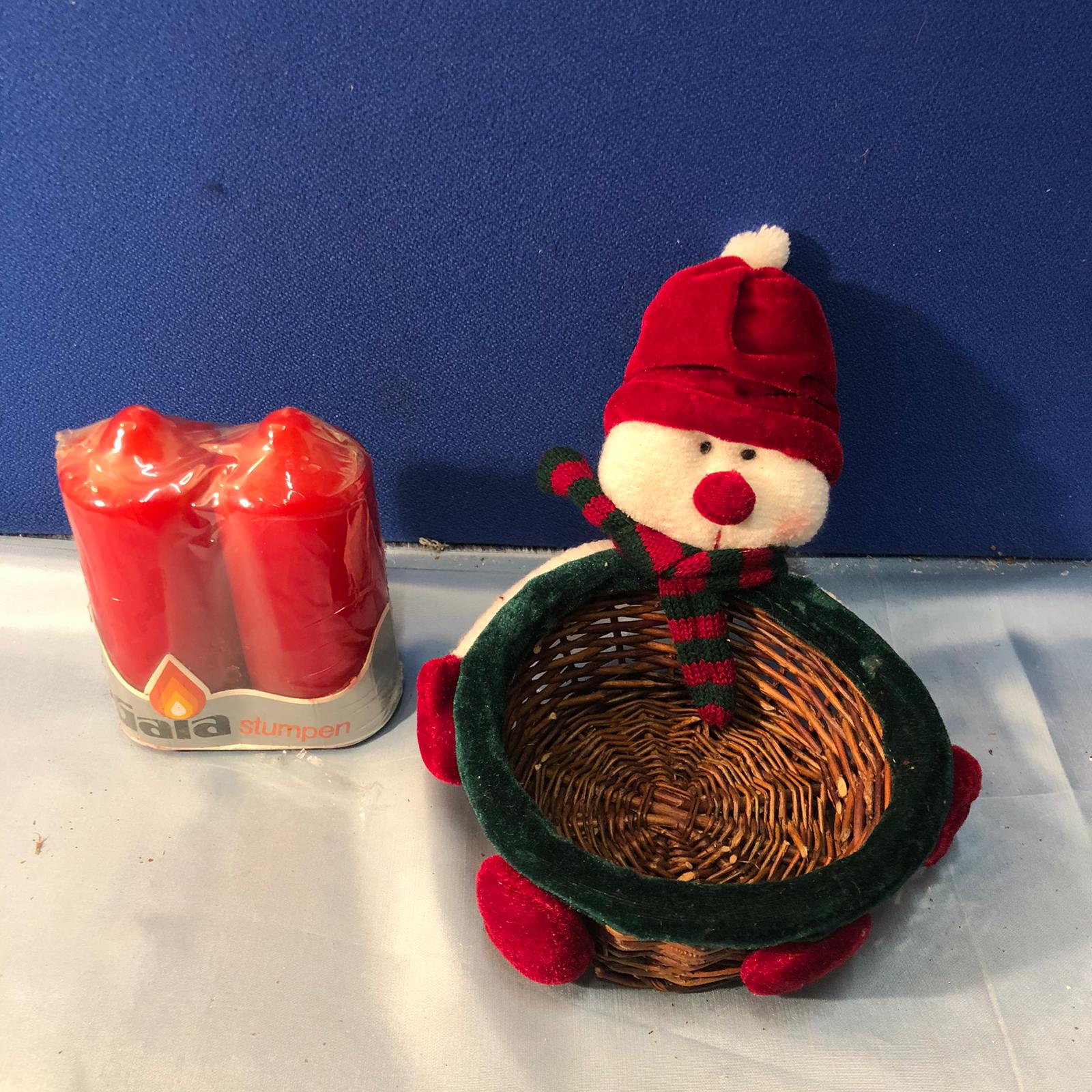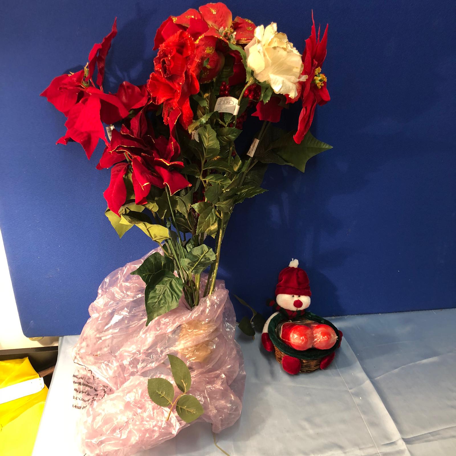 Addobbi a forma di fiori colorati e glitterati, adatti per addobbare la casa per creare un’aria natalizia, accompagnata da una cesta formata da un pupazzo di neve.