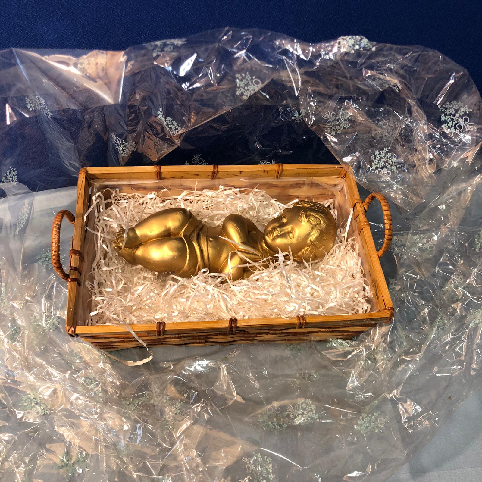 Bambino Gesù decorato in oro d(lunghezza 18 cm) entro una cesta impacchettato.
