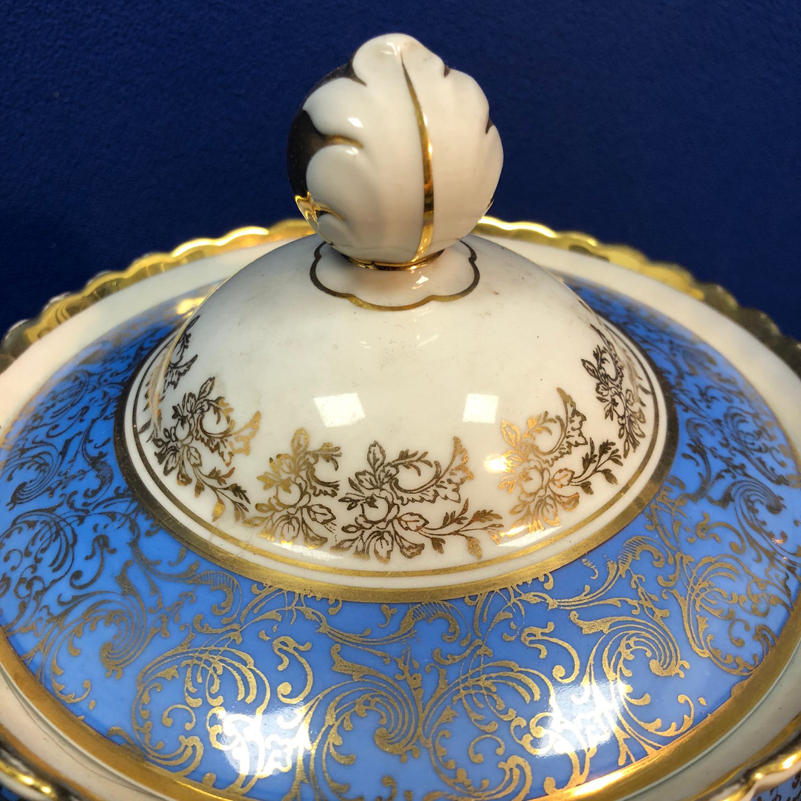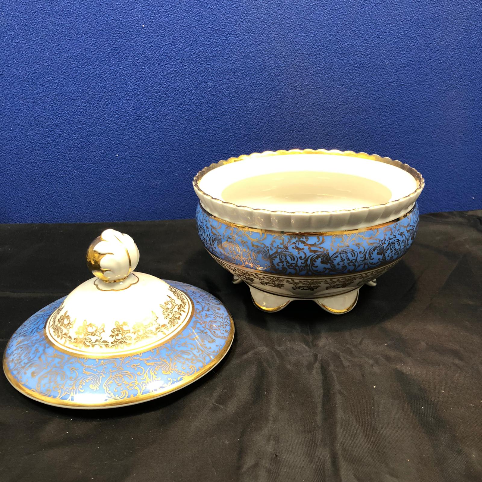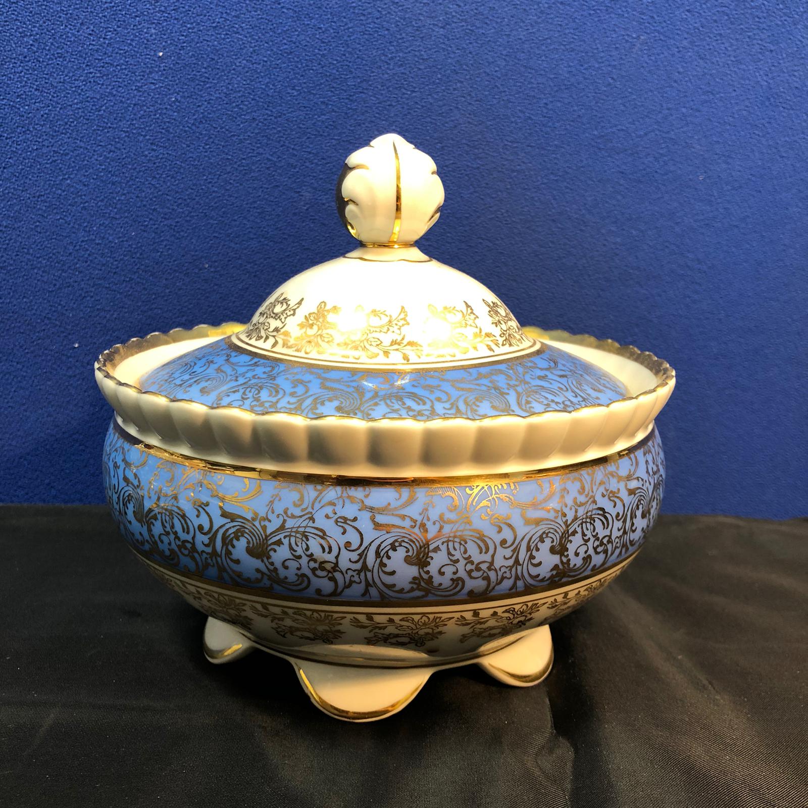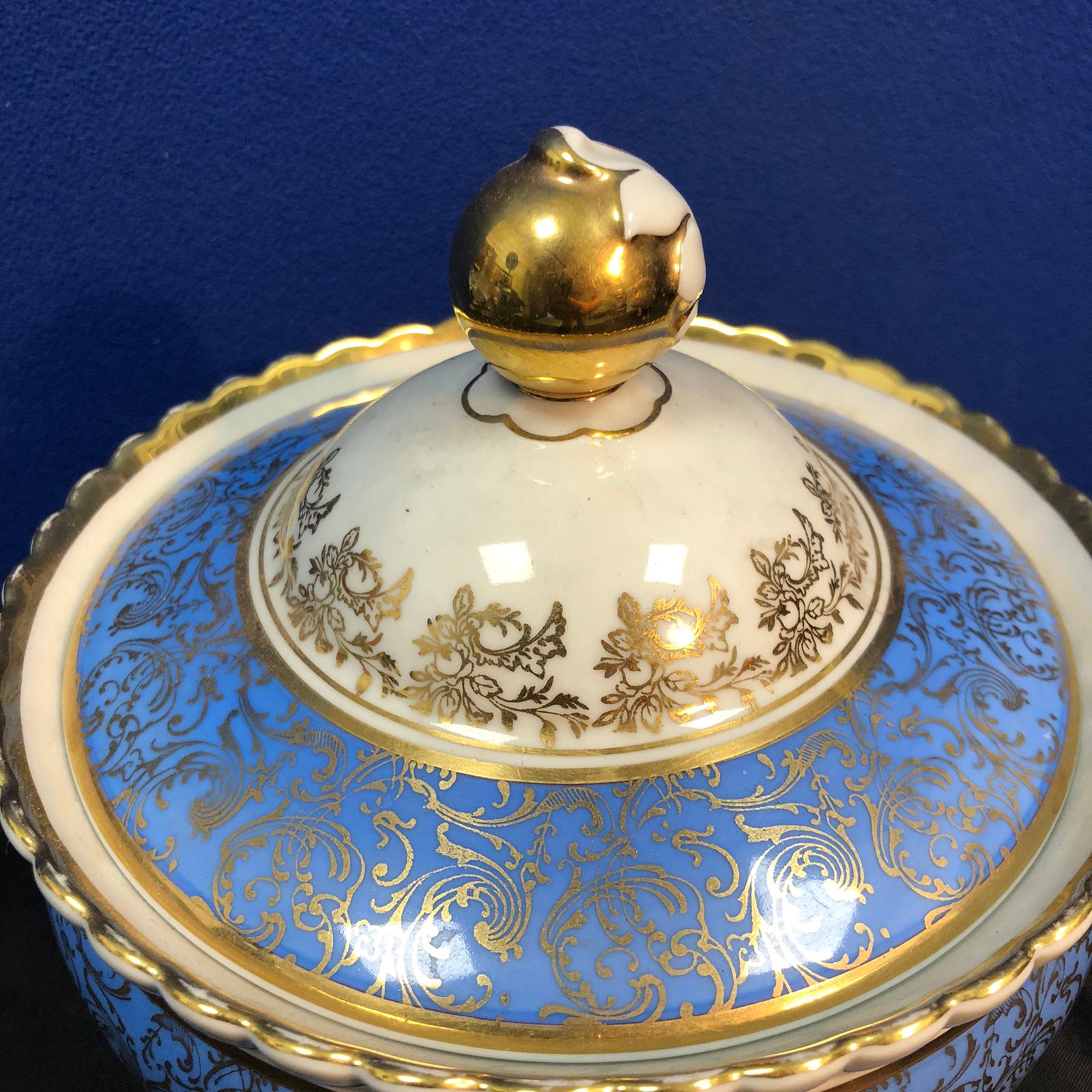 Biscottiera in porcellana Bavaria Jaeger Germany di colore azzurro e bianco con dettagli dorati. Il pomello del coperchio è di color dorato con disegnato una foglia bianca.