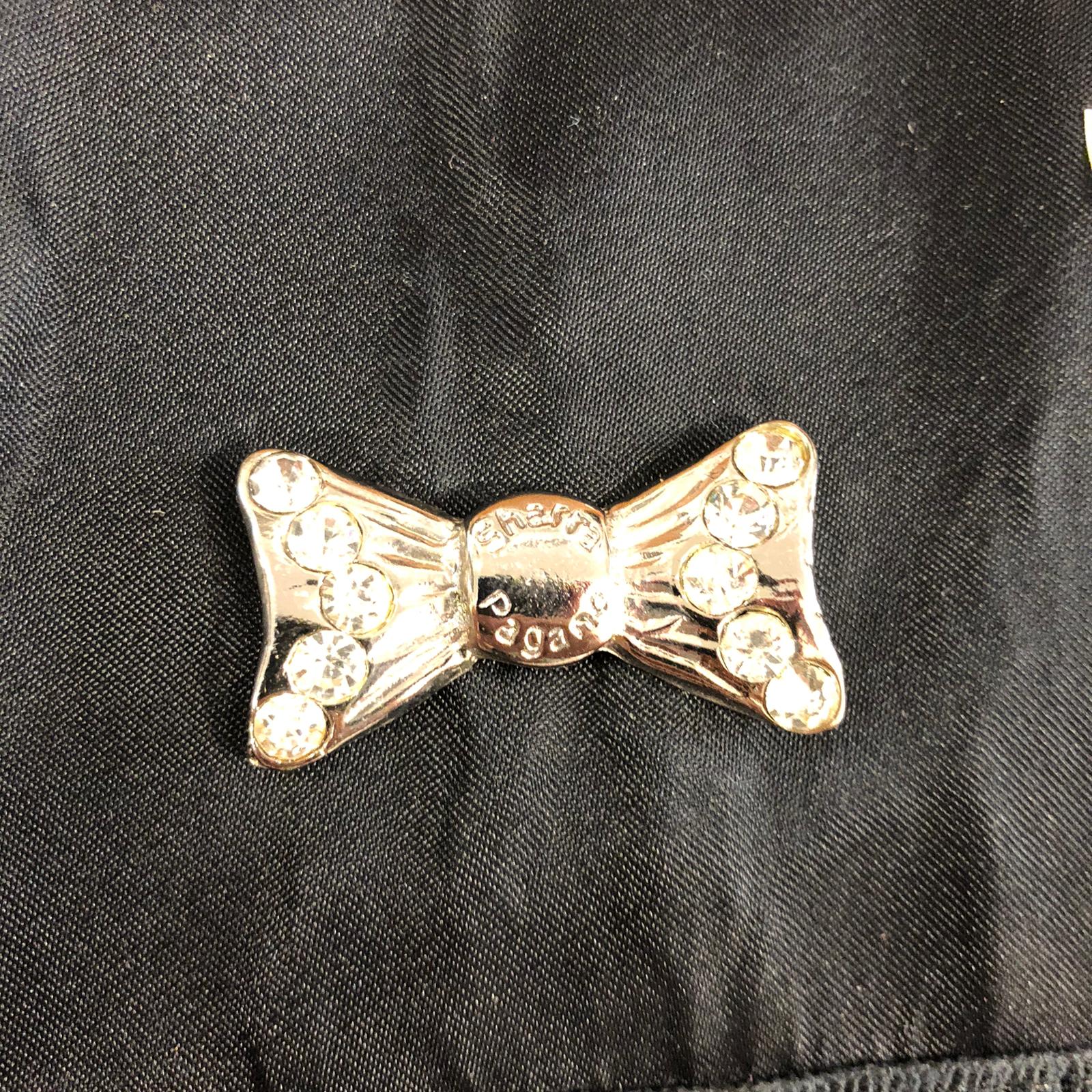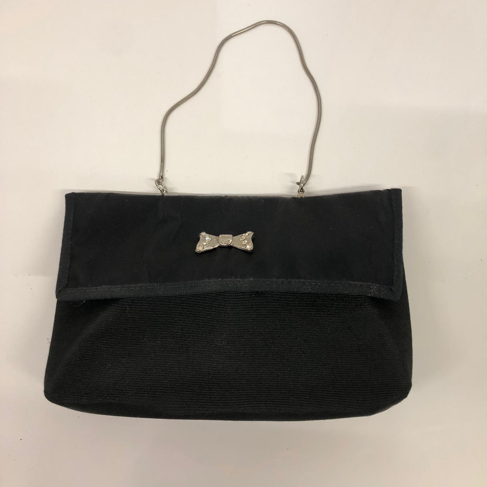 Borsetta vintage a tracolla nera con catena argentata con un bellissimo fiocco in metallo al centro, vicino al bottone della chiusura. Stile casual ma anche molto fine.