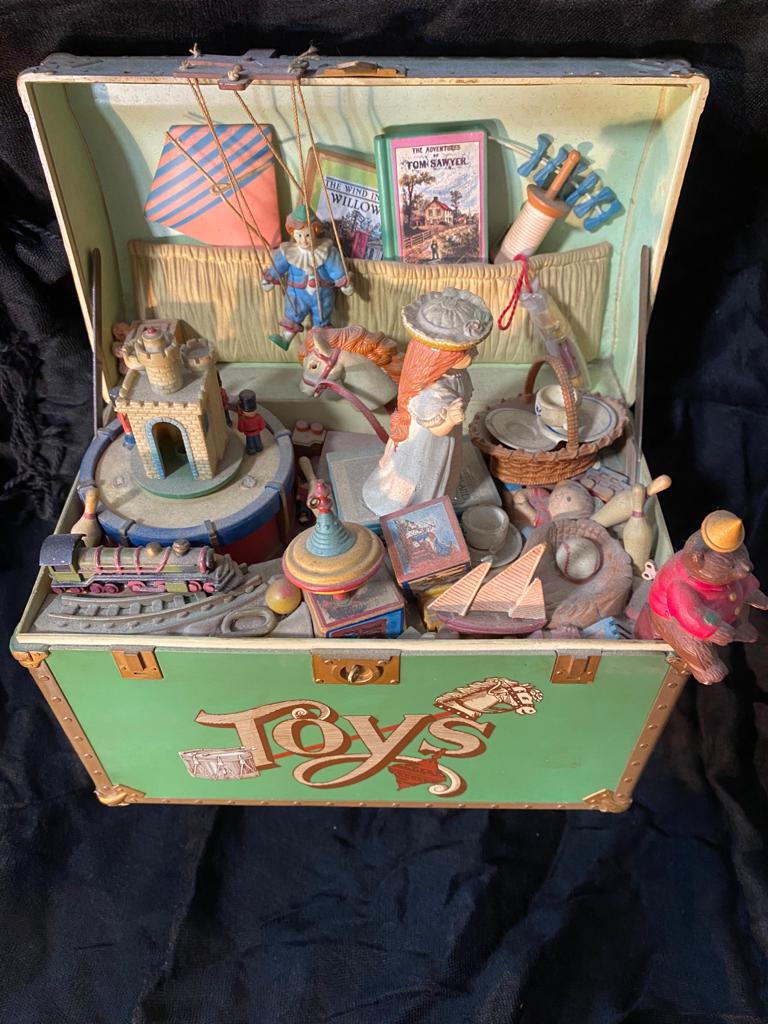 L’oggetto presenta giochi in miniatura vintage di diversi colori. Il baule non si chiude, rimanere aperto come mostrato in foto.