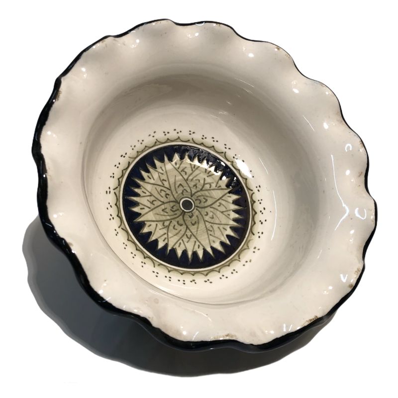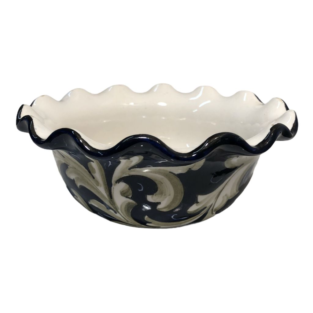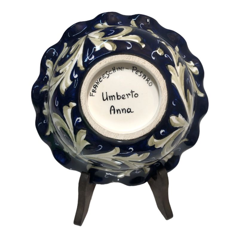 Centrotavola in ceramica smaltata del buon ricordo – Franceschini Pesaro – Umberto Anna. Realizzata artigianalmente c/colori contrastanti tra il blu e il bianco a motivi floreali c/bordo ondulato.
