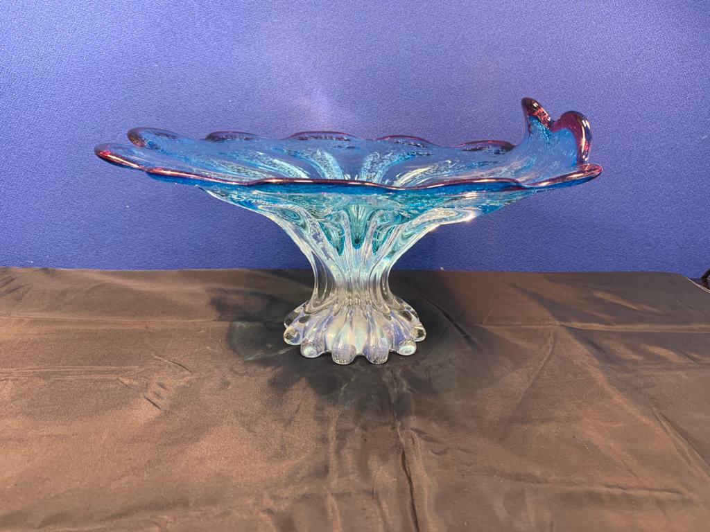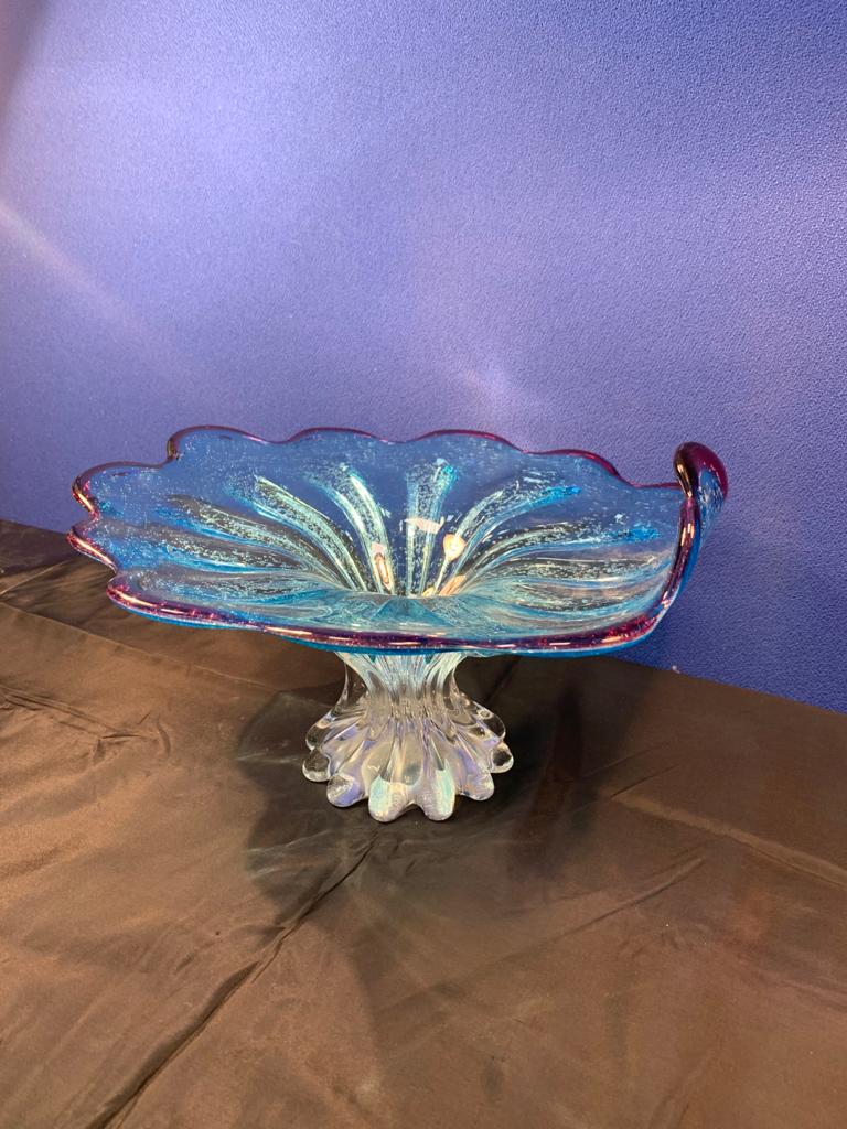 Centrotavola in vetro con bolle di colore azzurro contornato fucsia.