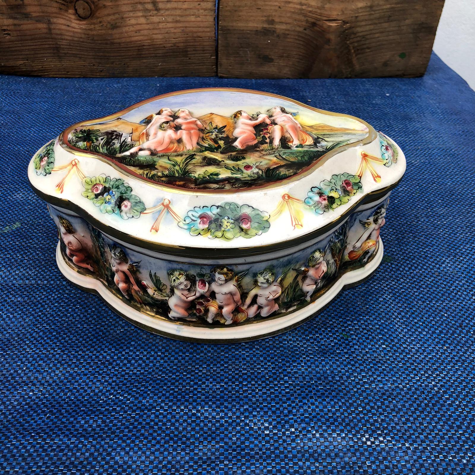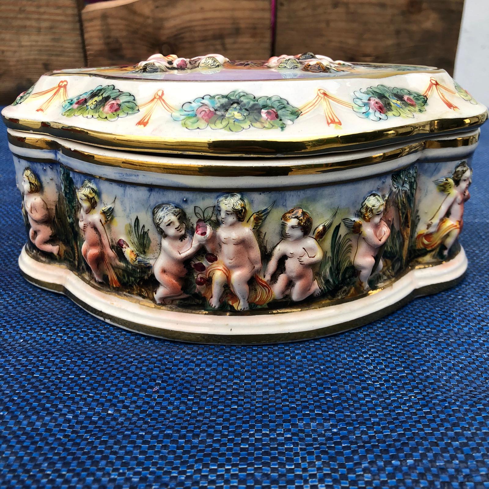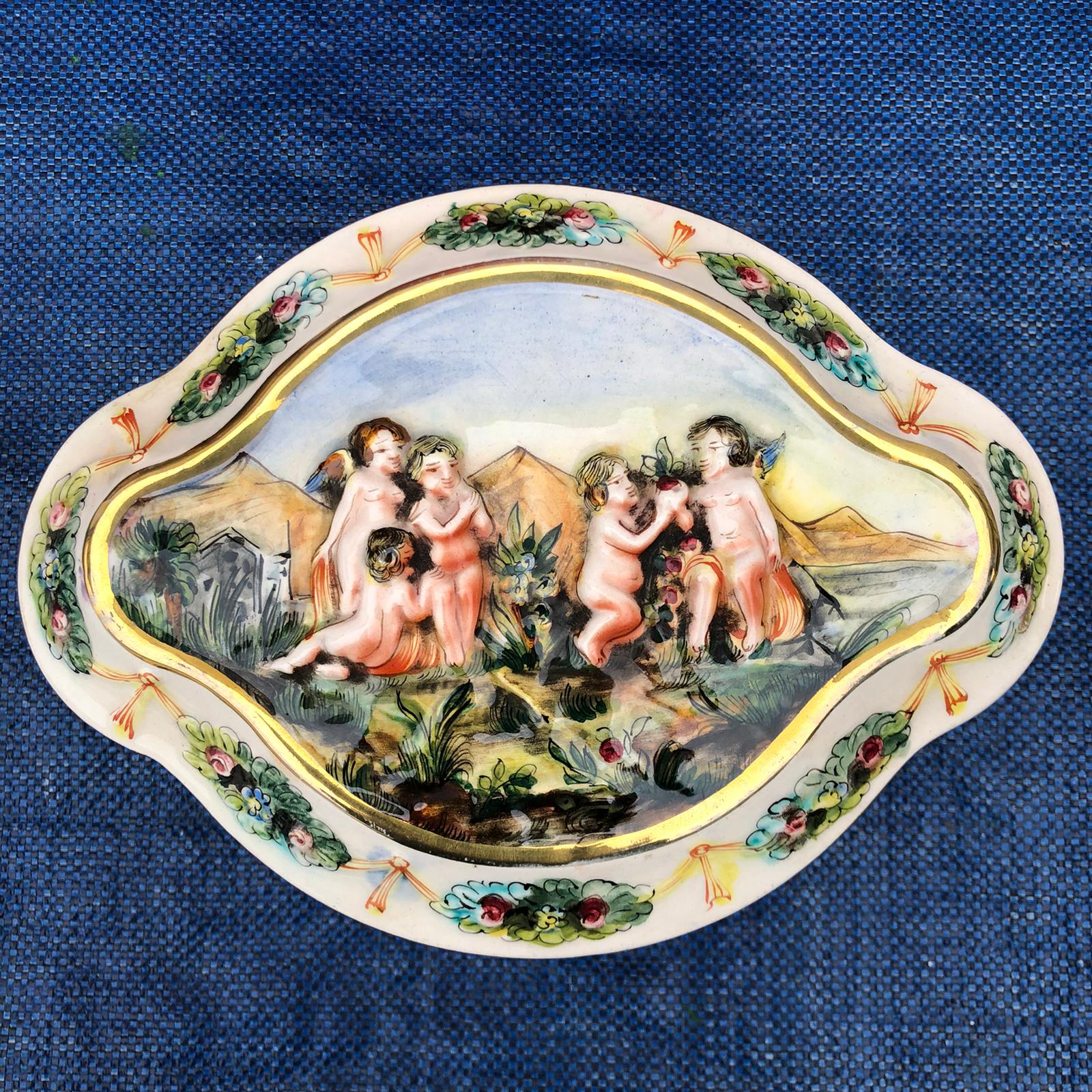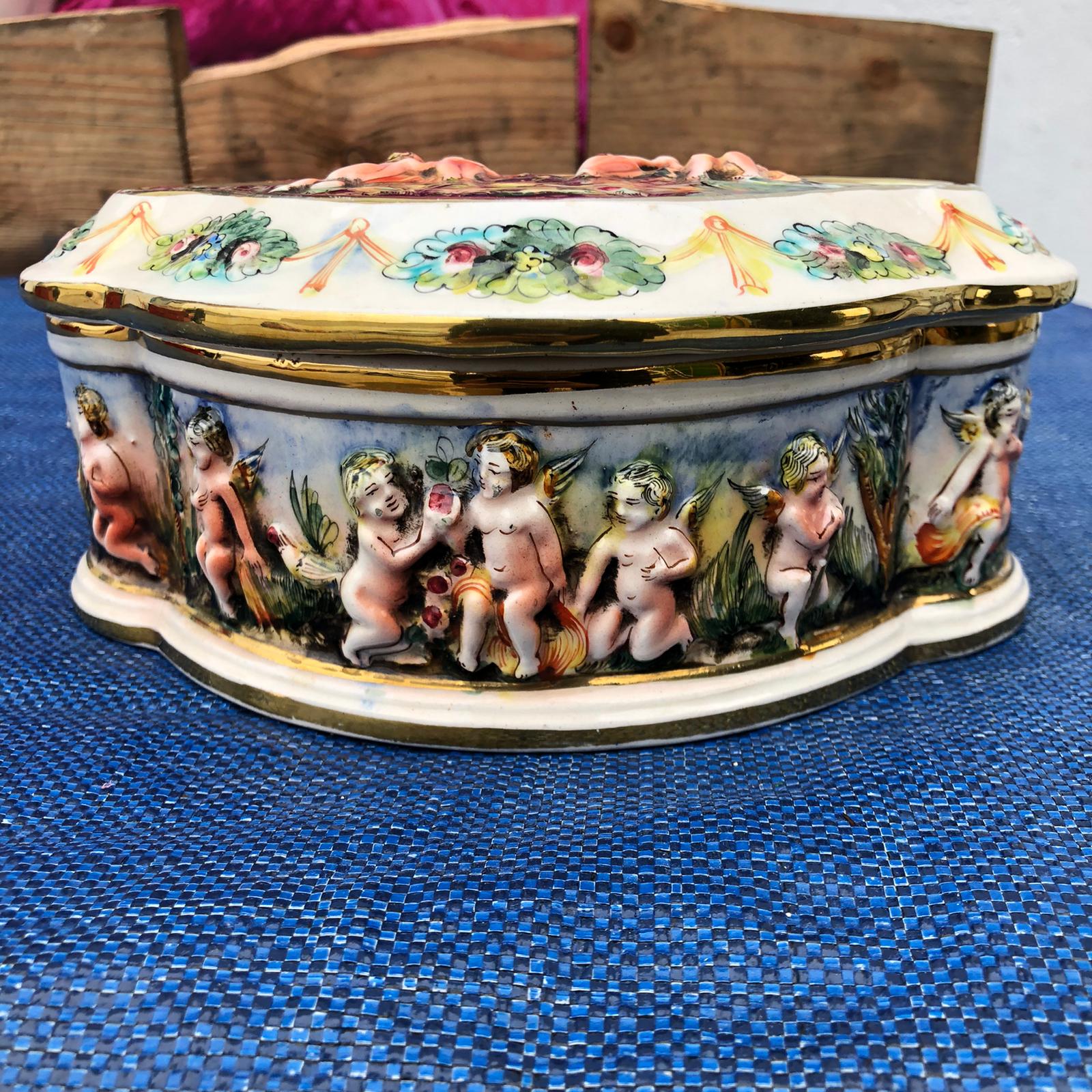 Cofanetto in porcellana di Capodimonte che raffigura angeli presentati in varie pose e colorate che sporgono verso l’esterno. I bordi sono dorati e presentano una forma molto elegante e raffinata. Porcellana del 1934.