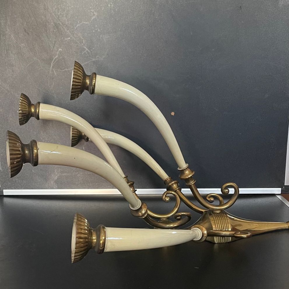 Coppia di applique a 5 luci in ottone e ottone smaltato bianco.