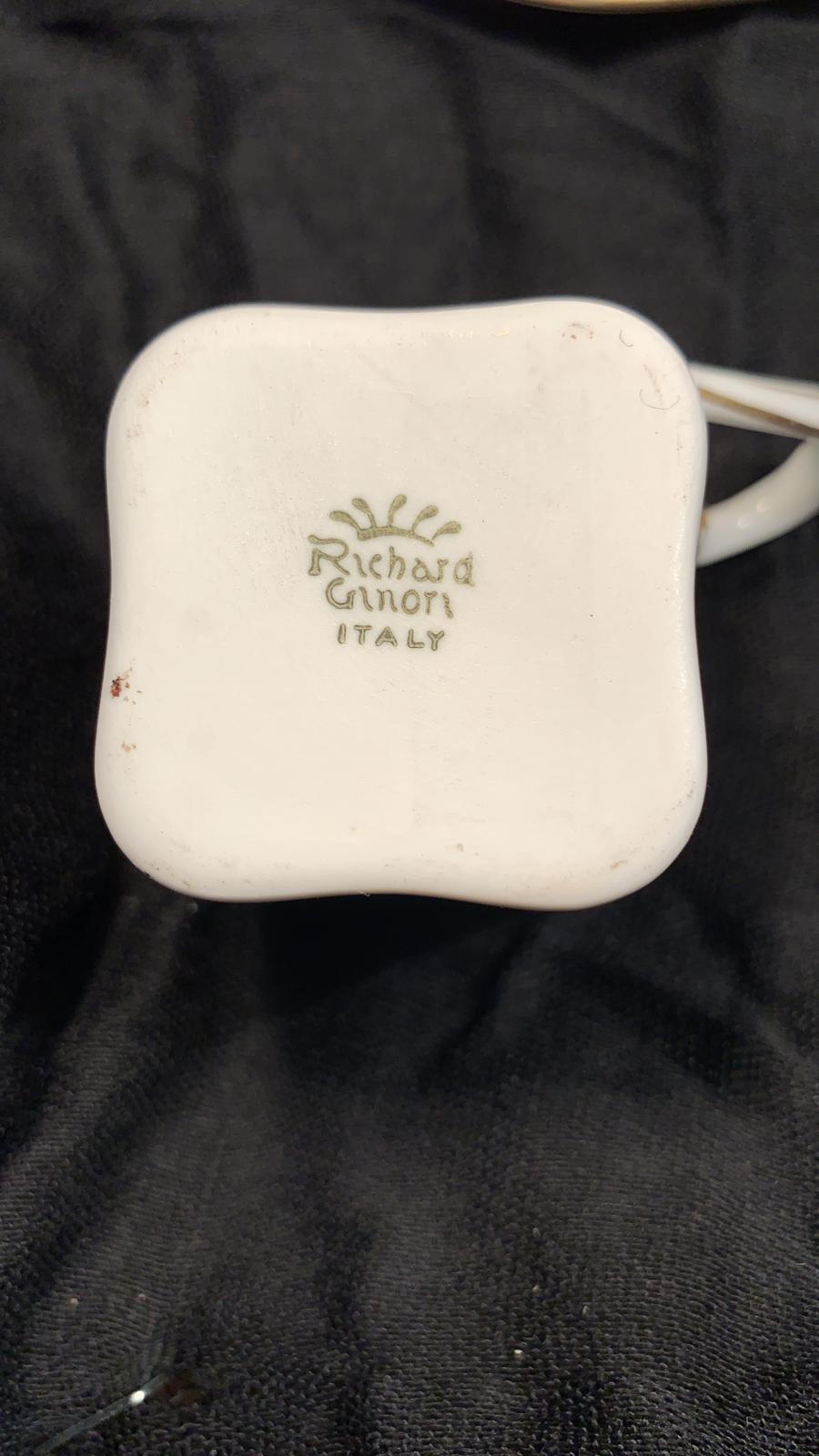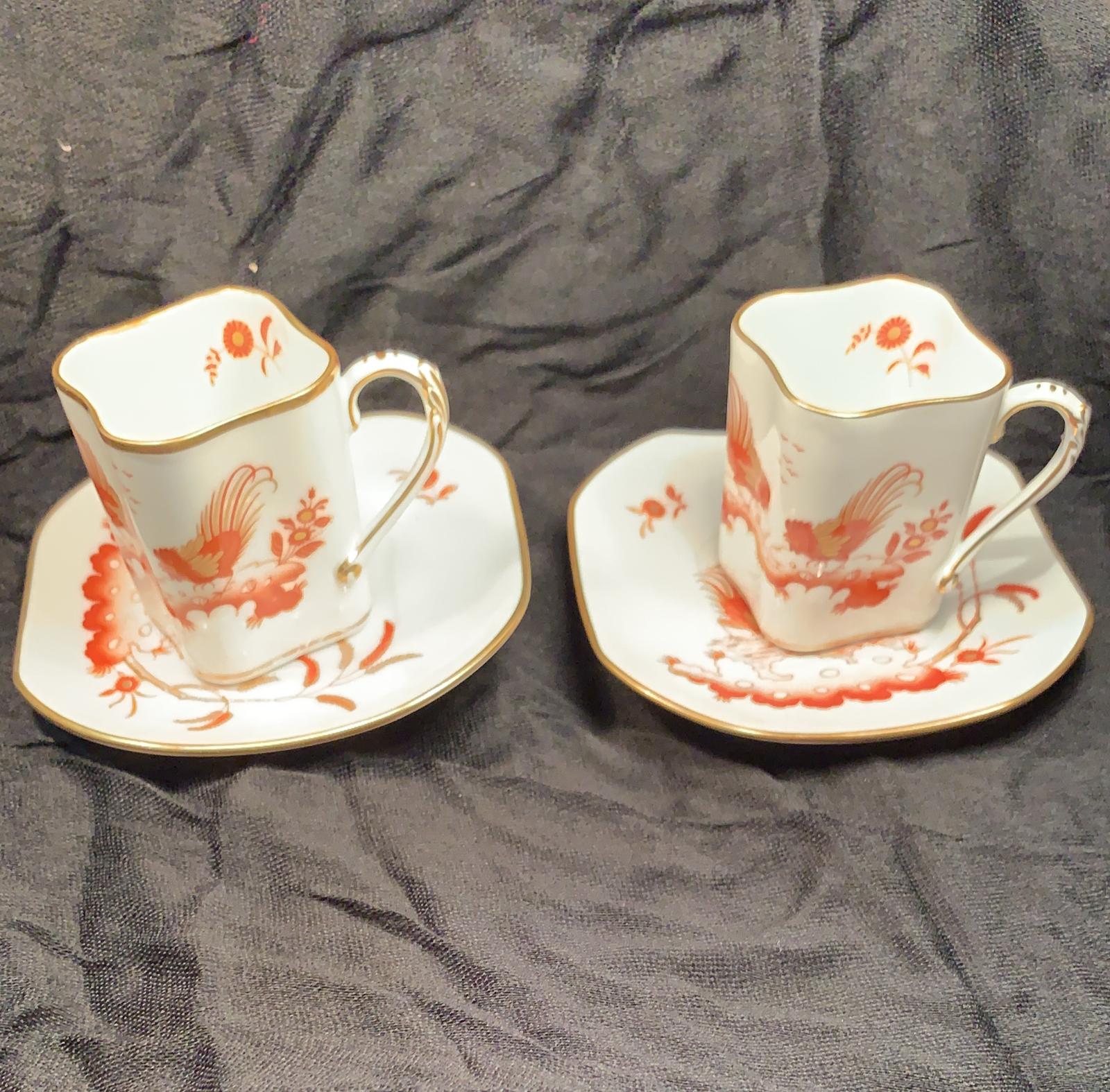 Coppia tazzine caffè (altezza 5,5 cm – lunghezza 4,5 cm – larghezza 5,5 cm) con piattino (lunghezza 10,5 cm – larghezza 10,5 cm) in porcellana Richard Ginori “Galli Rossi”.