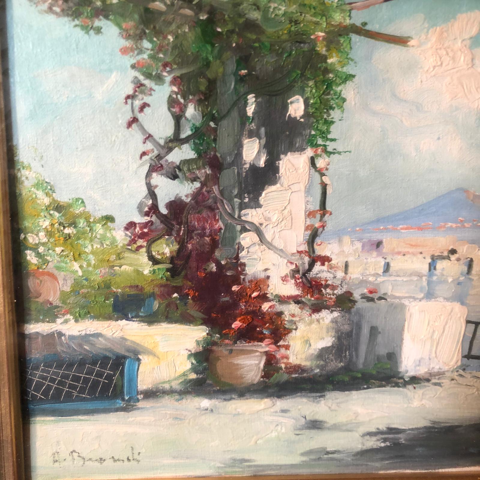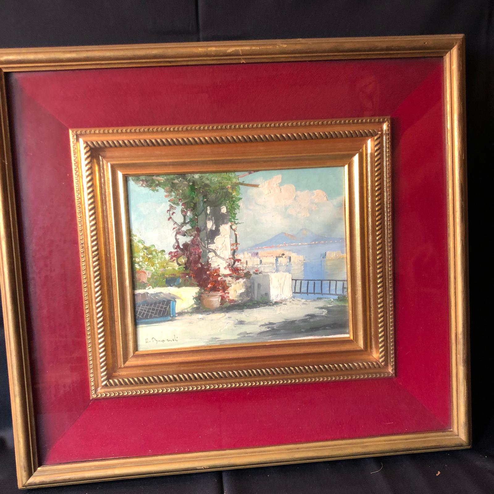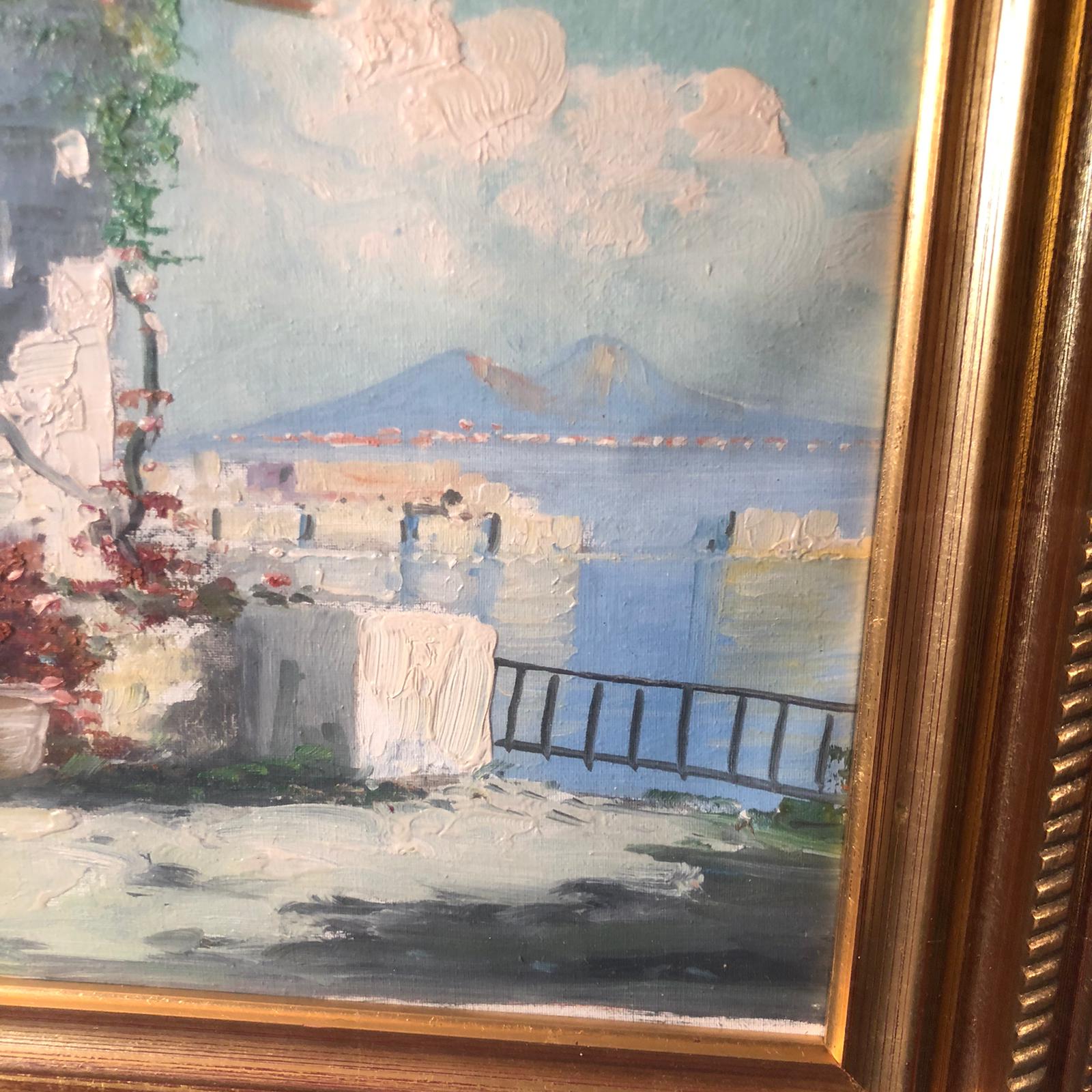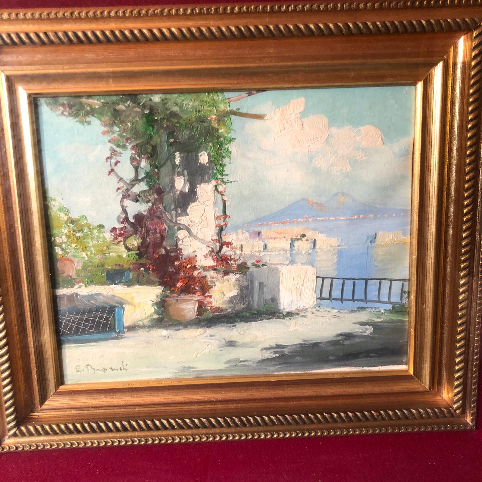 Incorniciato in doppia cornice in legno dorato. Il dipinto raffigura una terrazza vista lago.