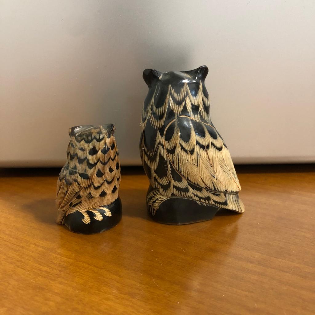 Coppia di gufetti in miniatura in legno intagliato, dipinto a mano.