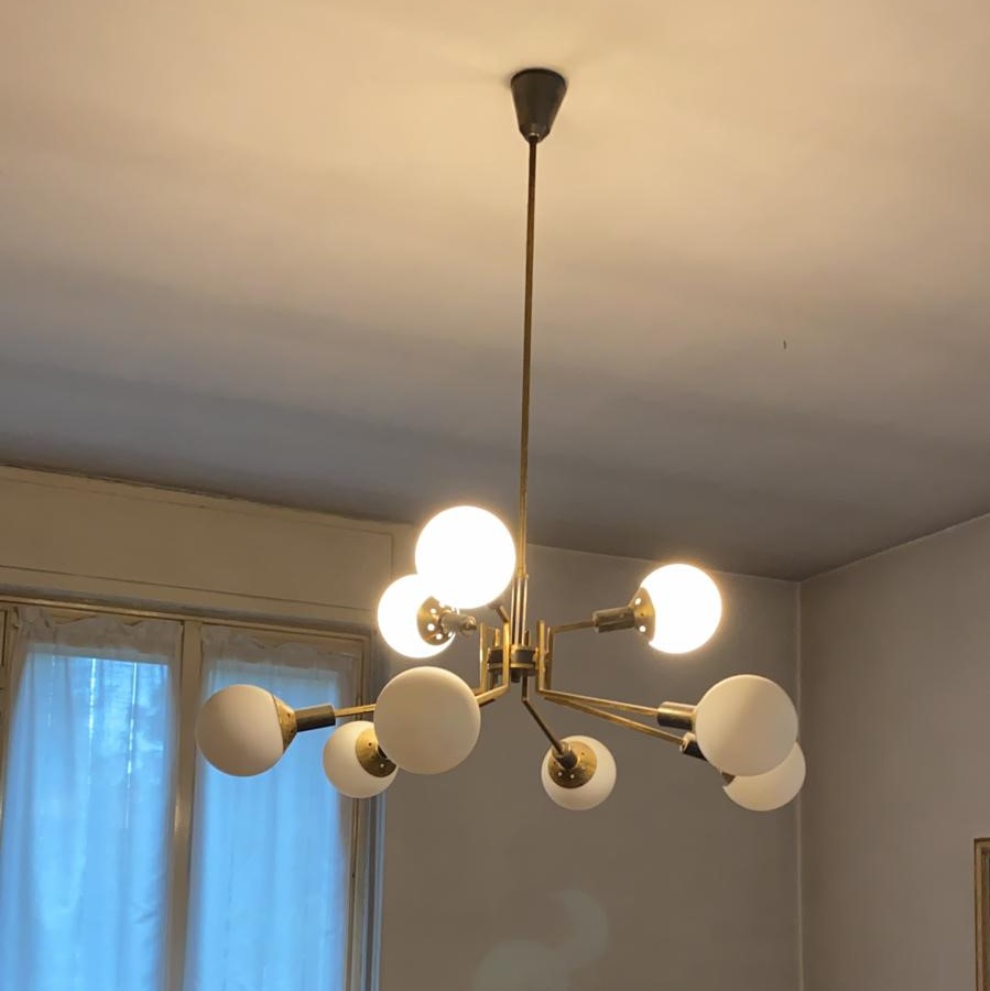 Lampadario moderno in ottone con una forma particolare con 9 luci a forma di palla.