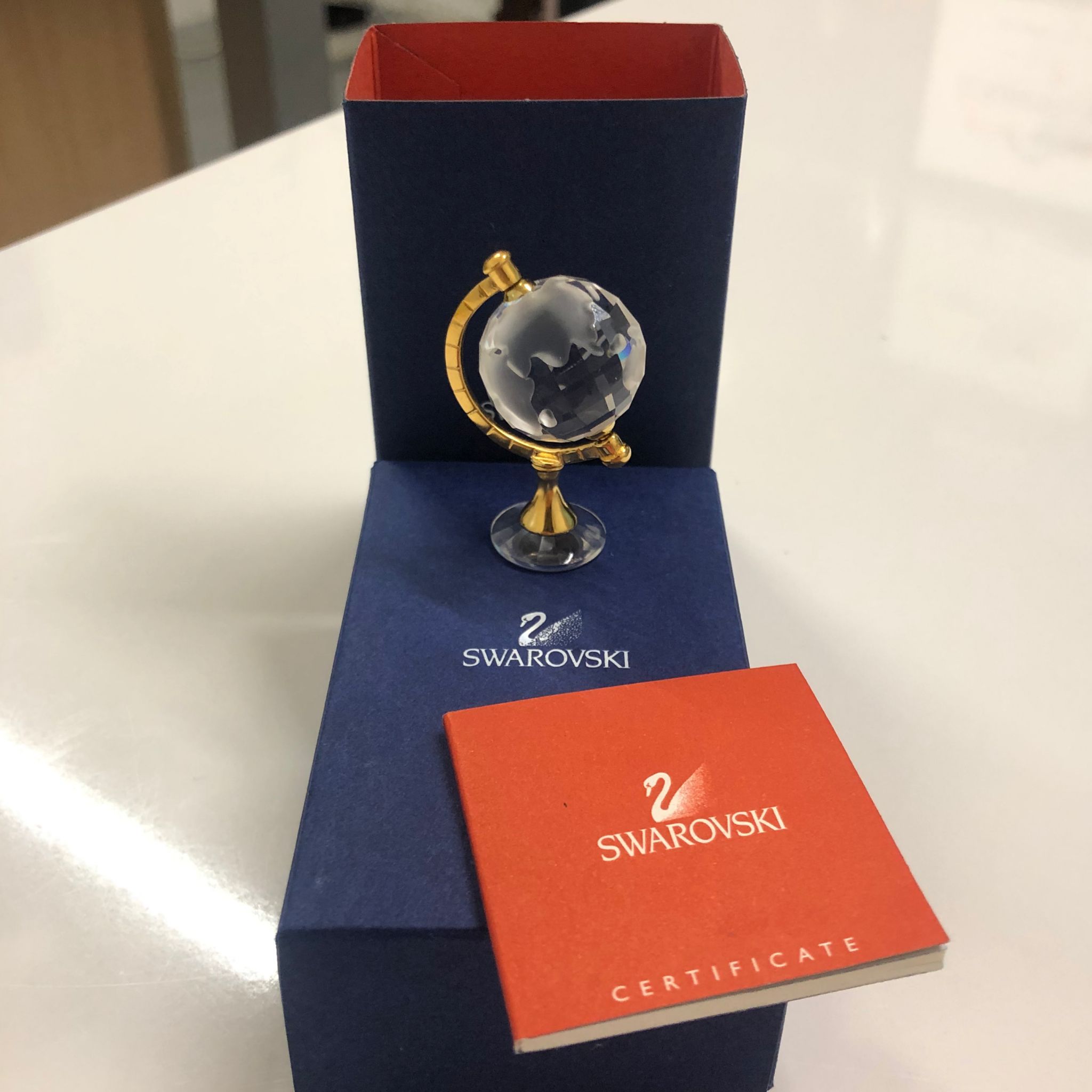 Piccolo mappamondo in Swarovski con supporto in ottone e logo, presente alla base (come mostrato in foto).