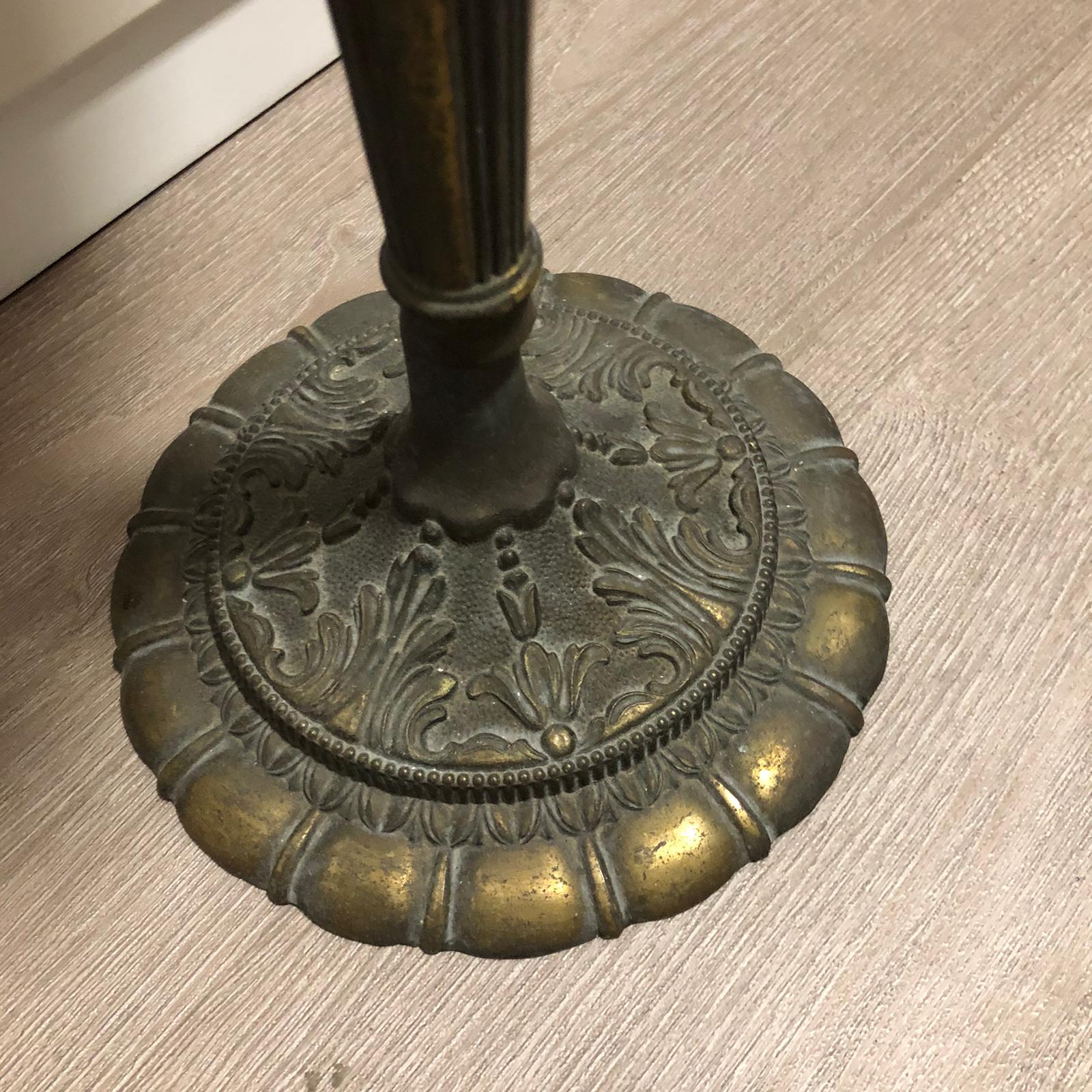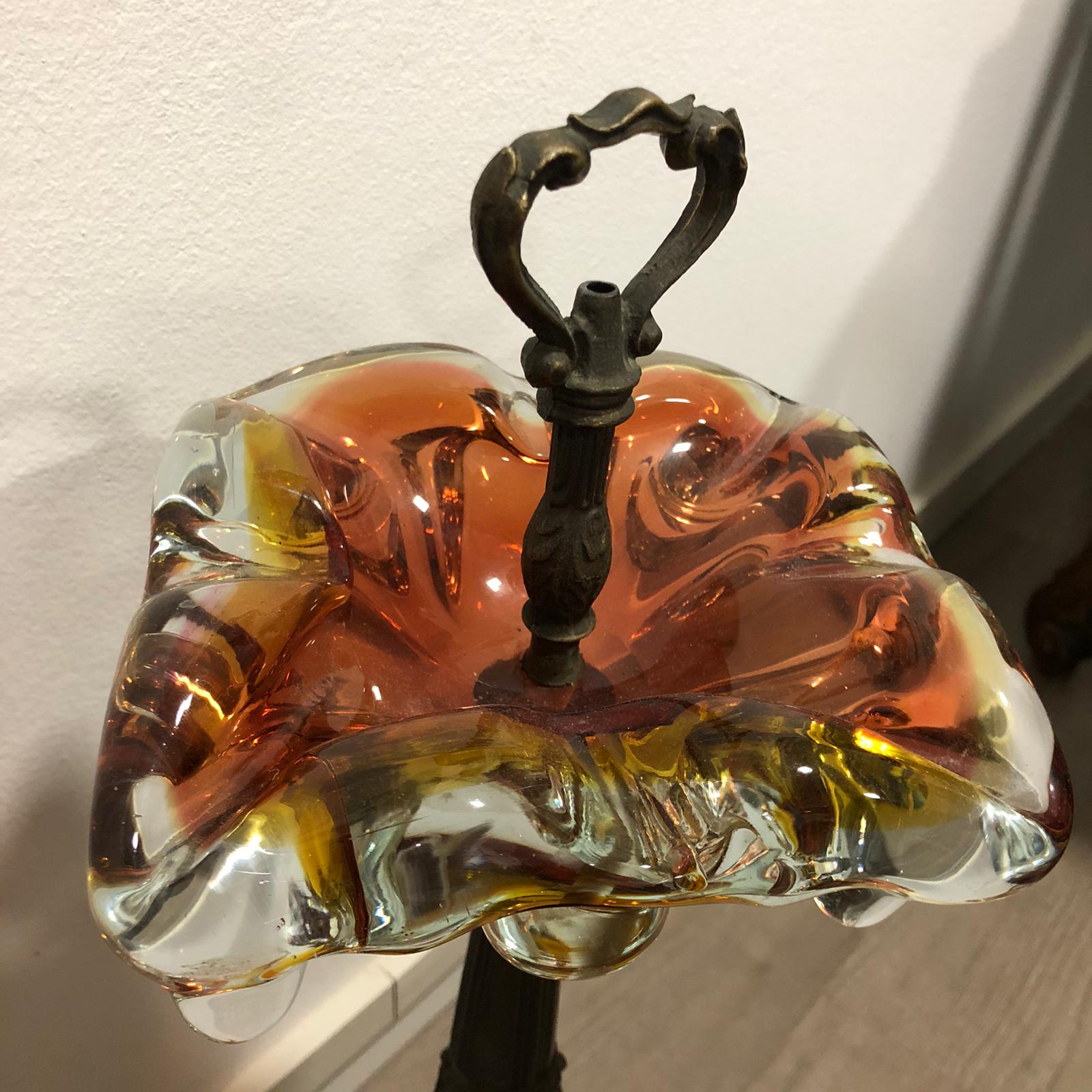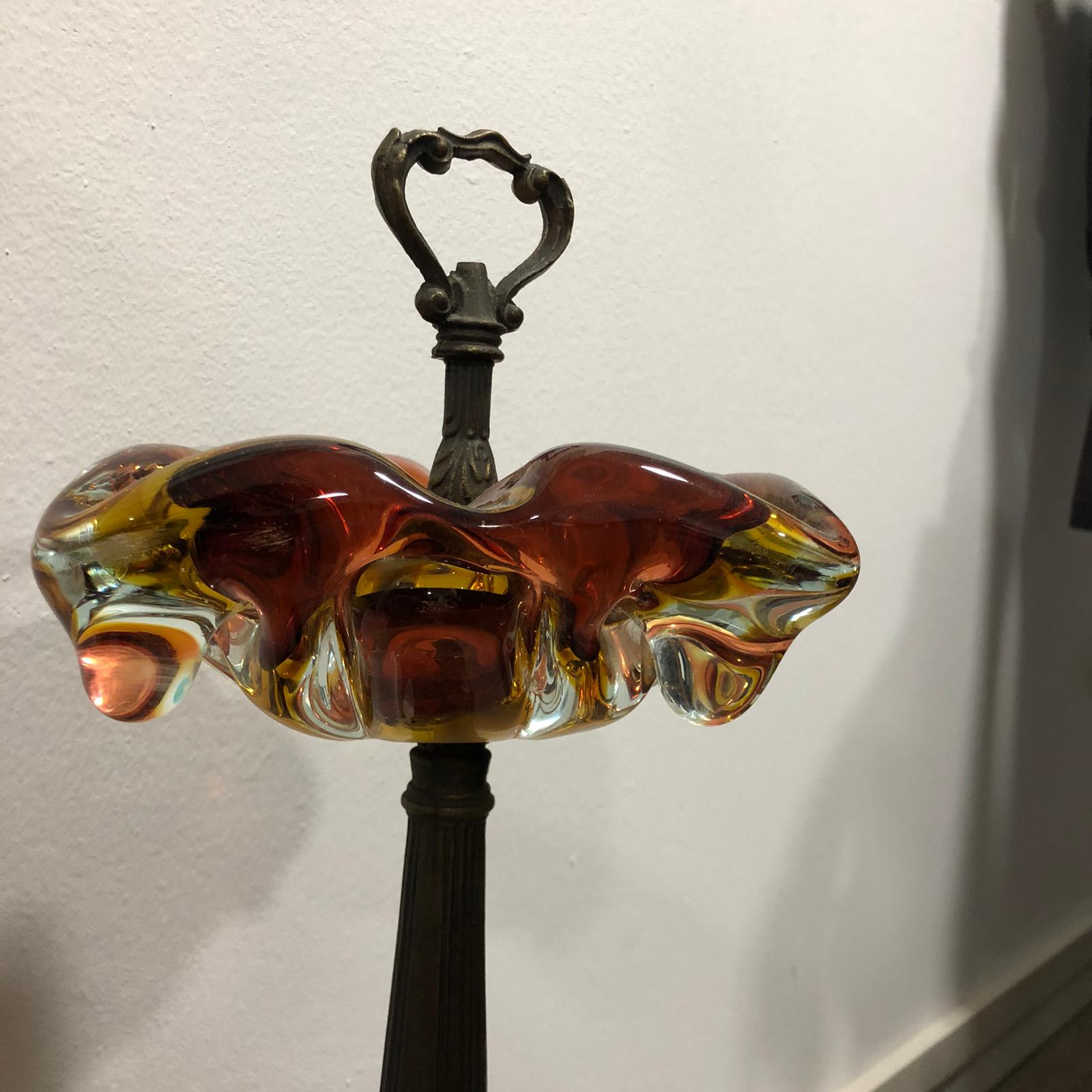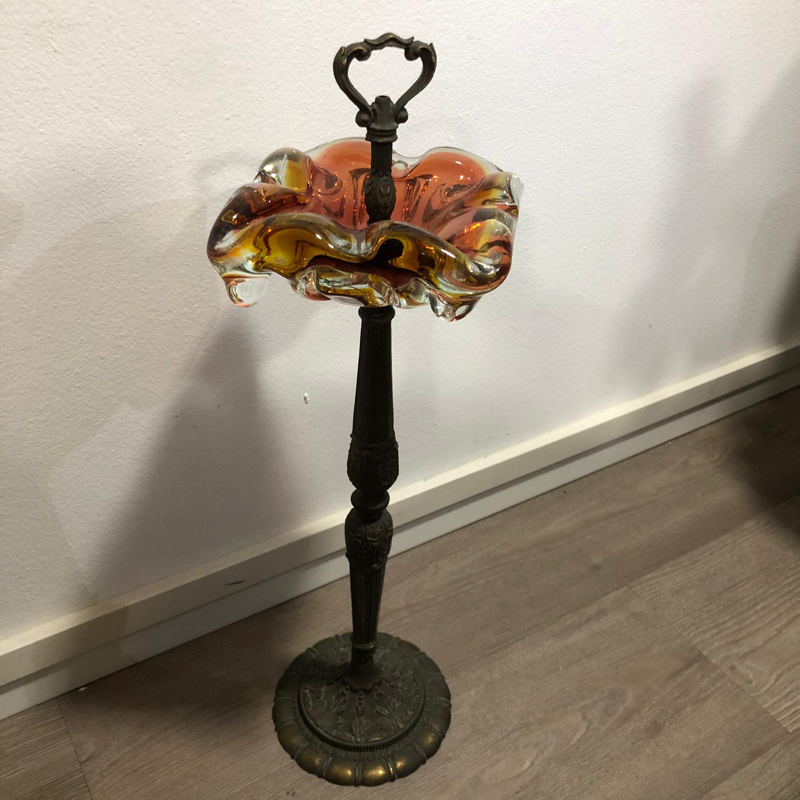 Bellissimo posacenere in vetro di Murano in stile liberty, sfumato con i colori: arancione, giallo e marrone, con base in ottone intagliato e sbalzato.