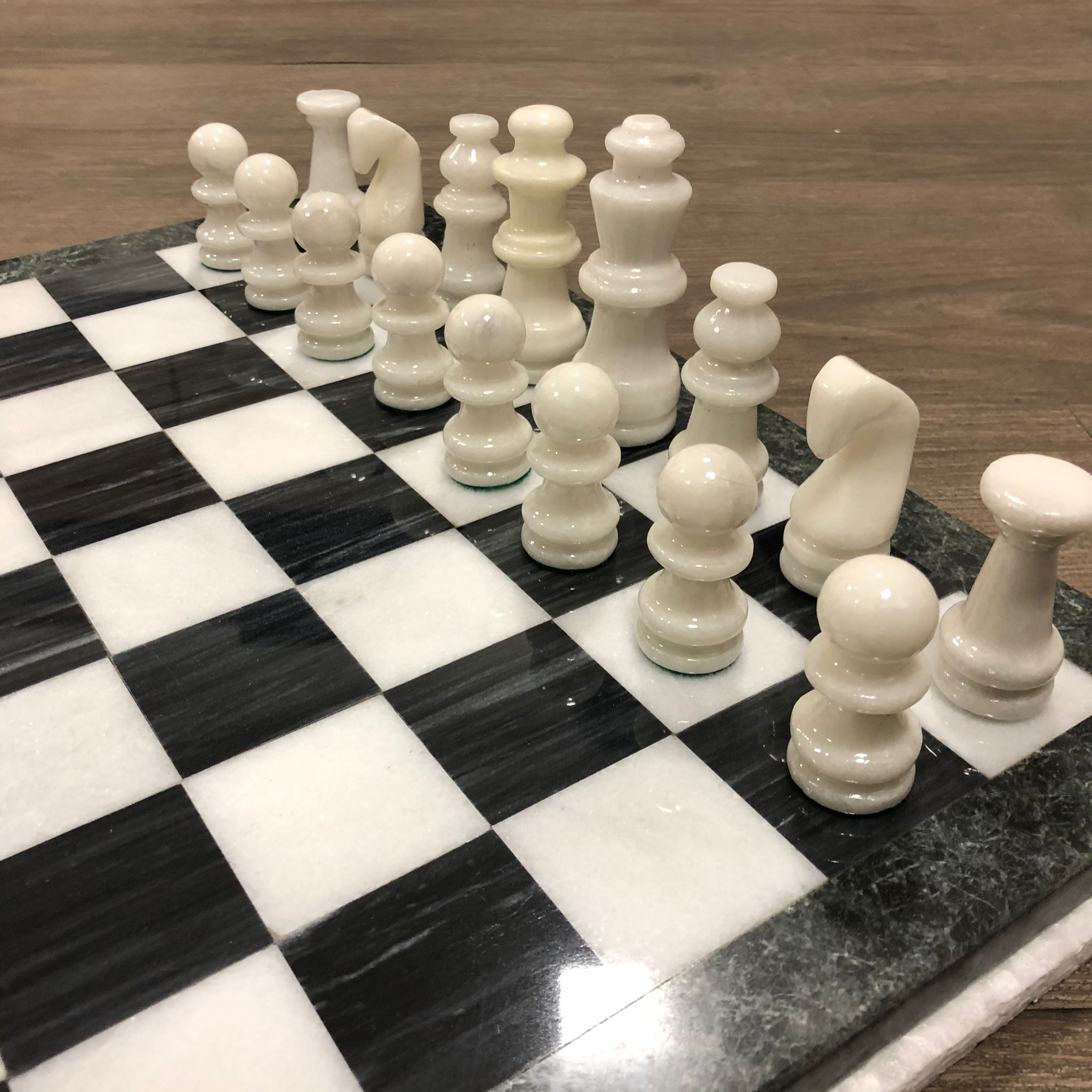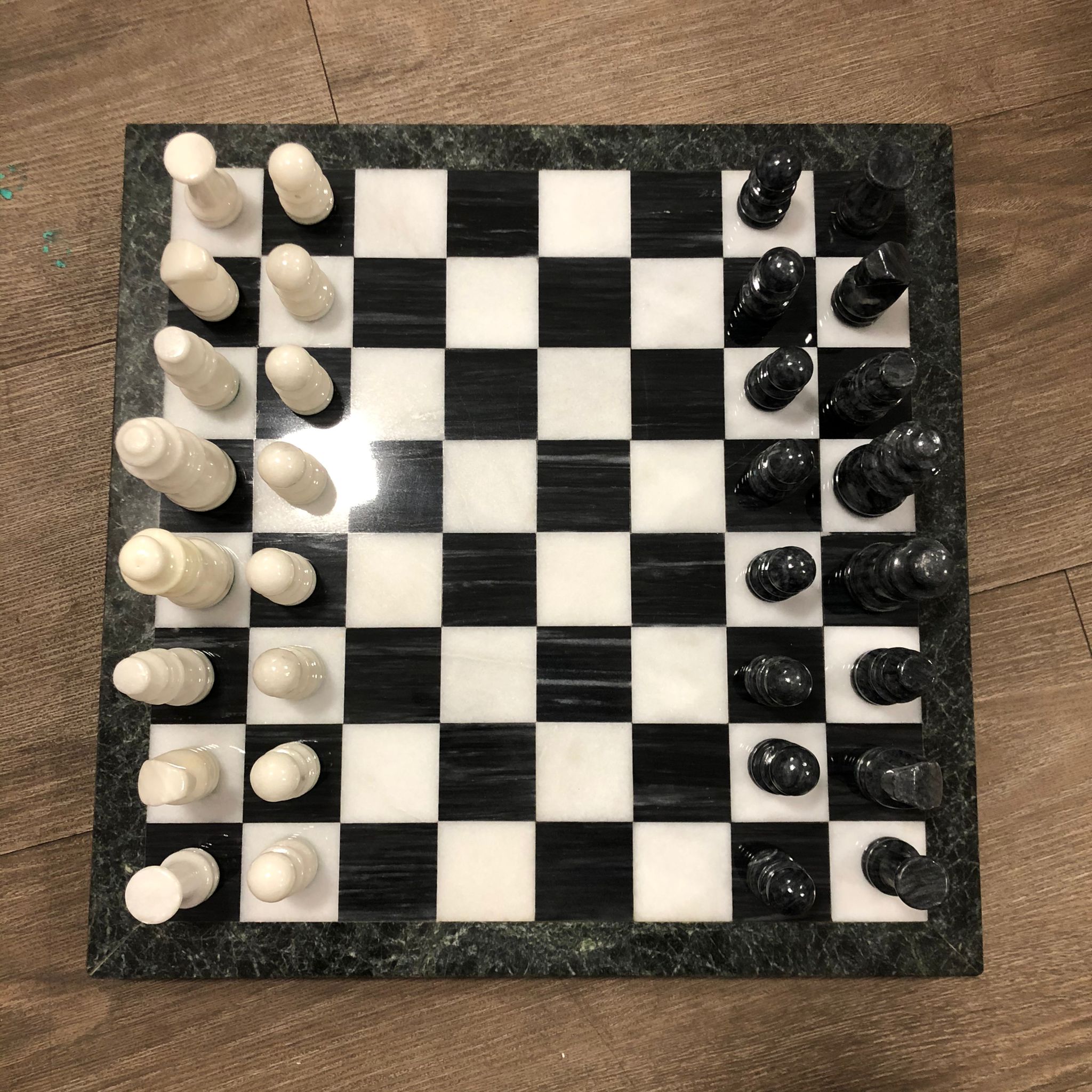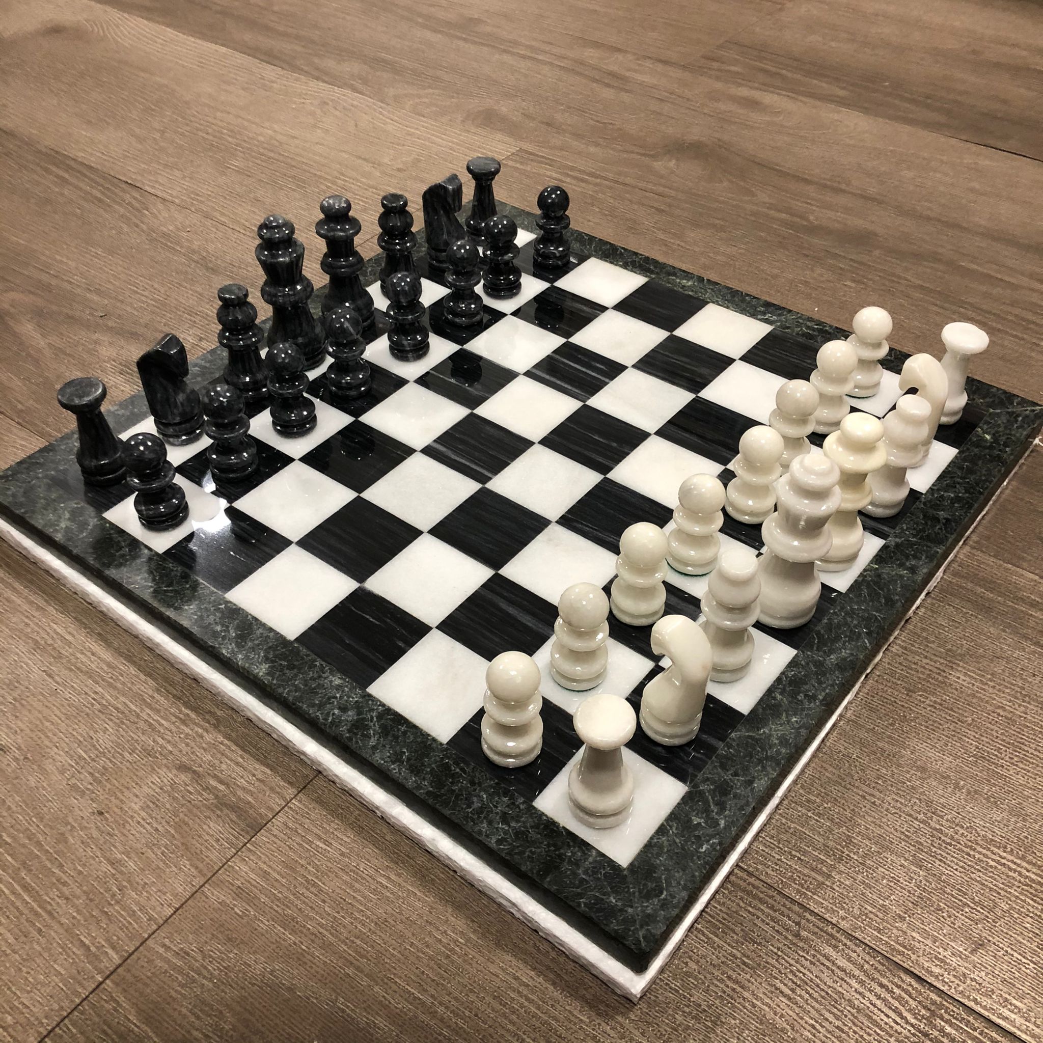 Bellissima scacchiera in marmo fornito in un imballaggio sicuro che li tiene ben protetti dalle collisioni. La scacchiera è composta da marmi verdi e bianchi. Set molto elegante.