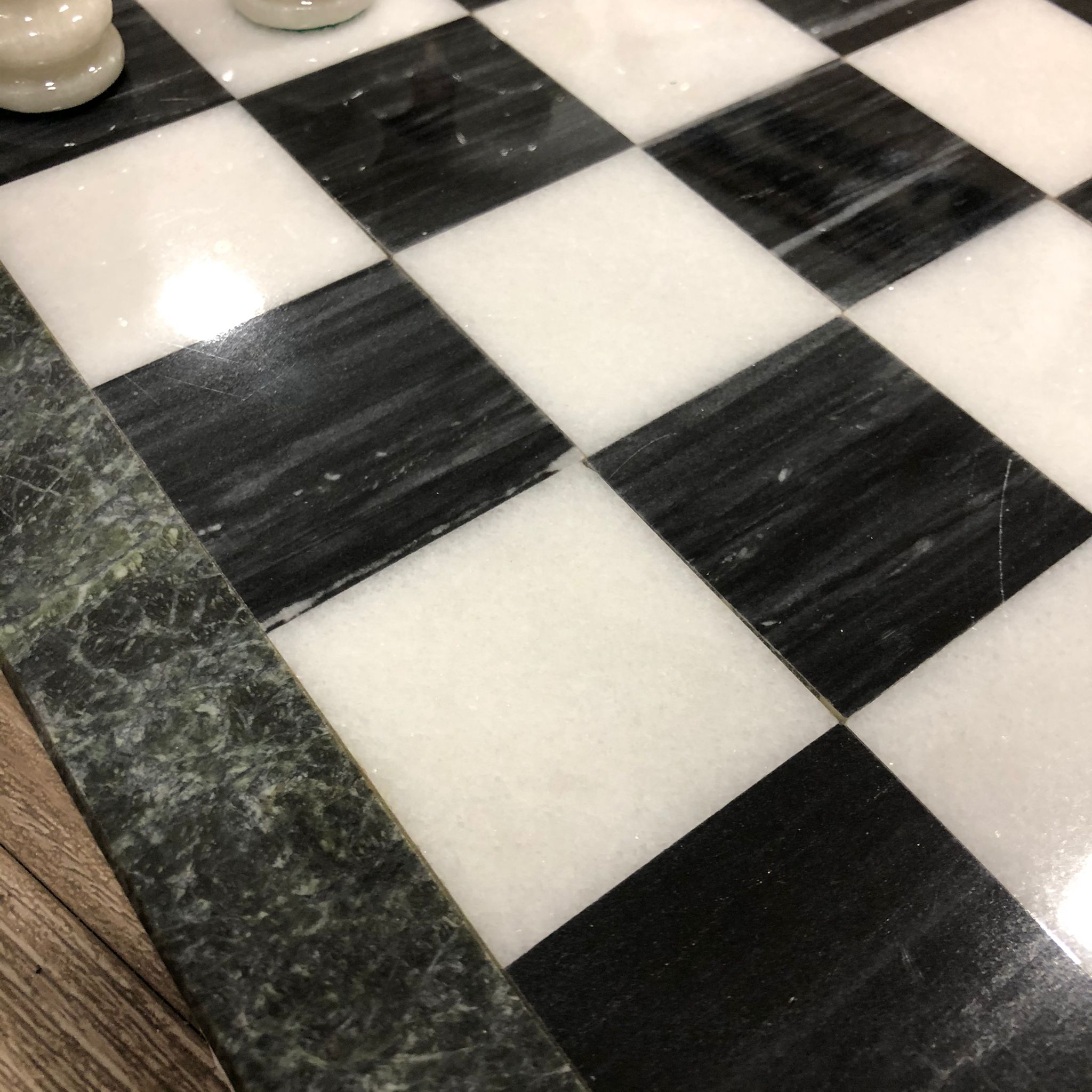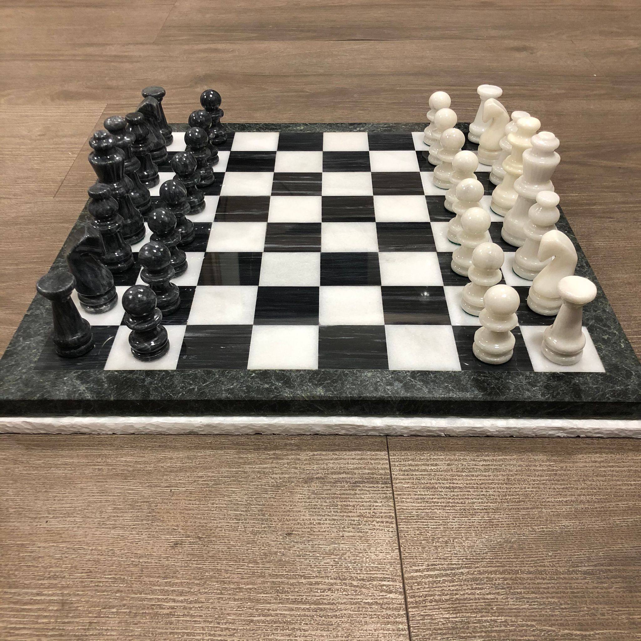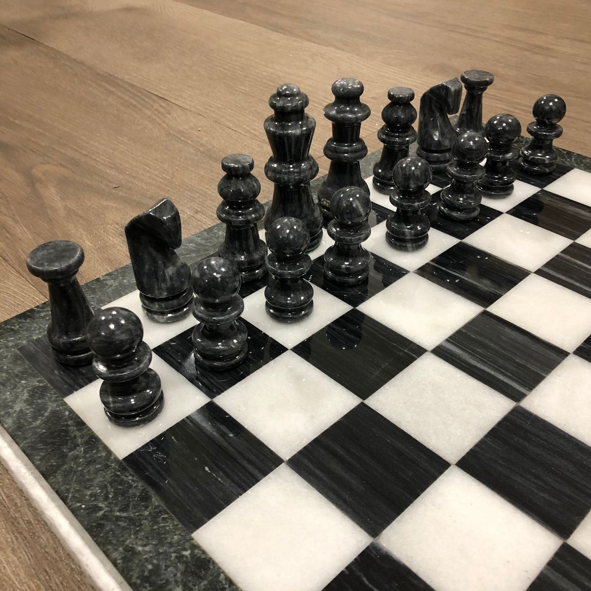 Bellissima scacchiera in marmo fornito in un imballaggio sicuro che li tiene ben protetti dalle collisioni. La scacchiera è composta da marmi verdi e bianchi. Set molto elegante.