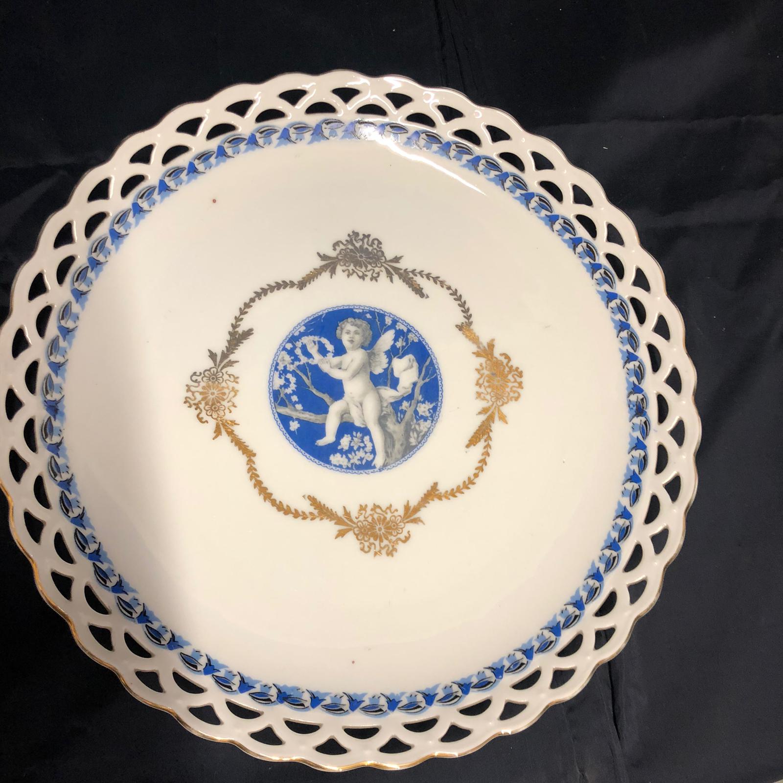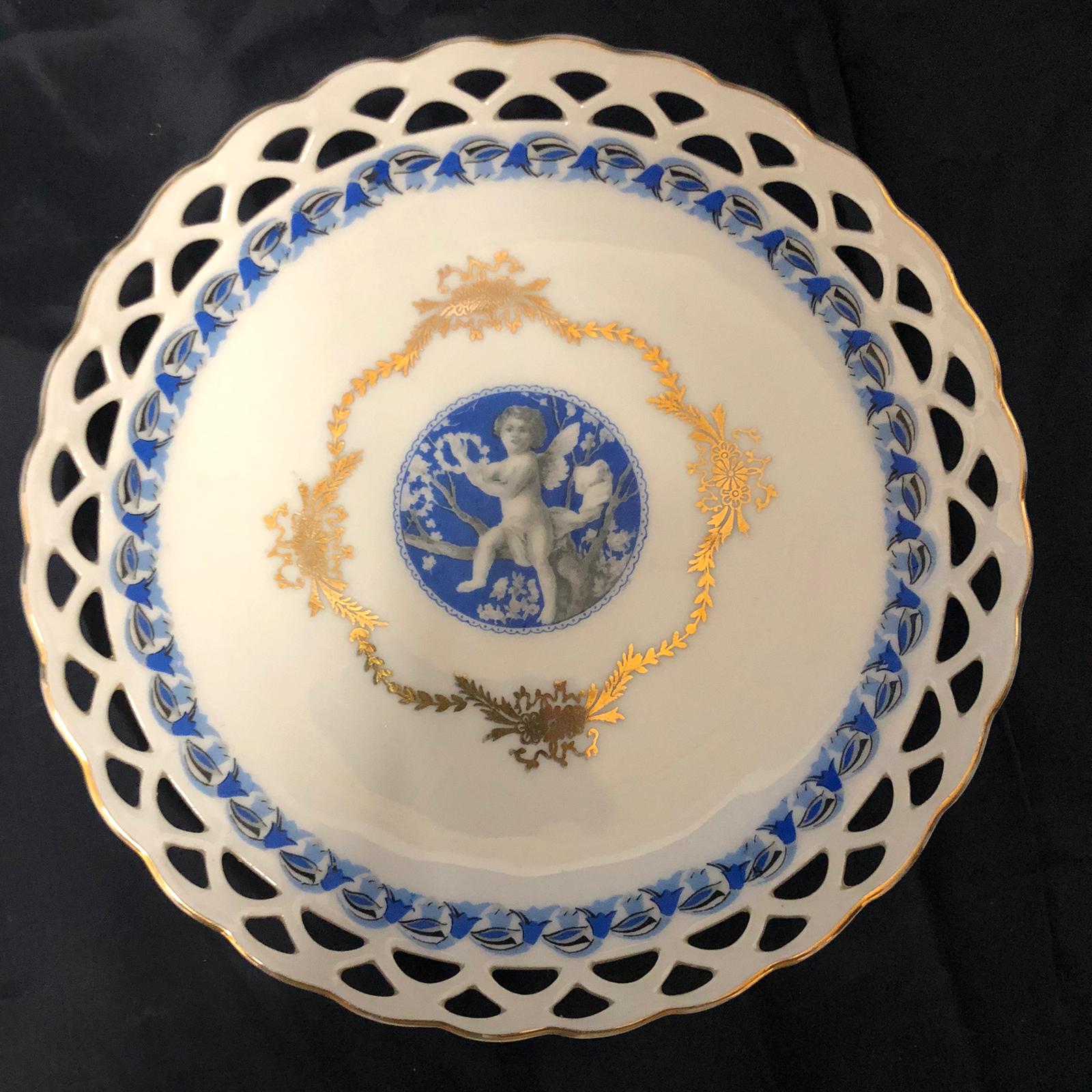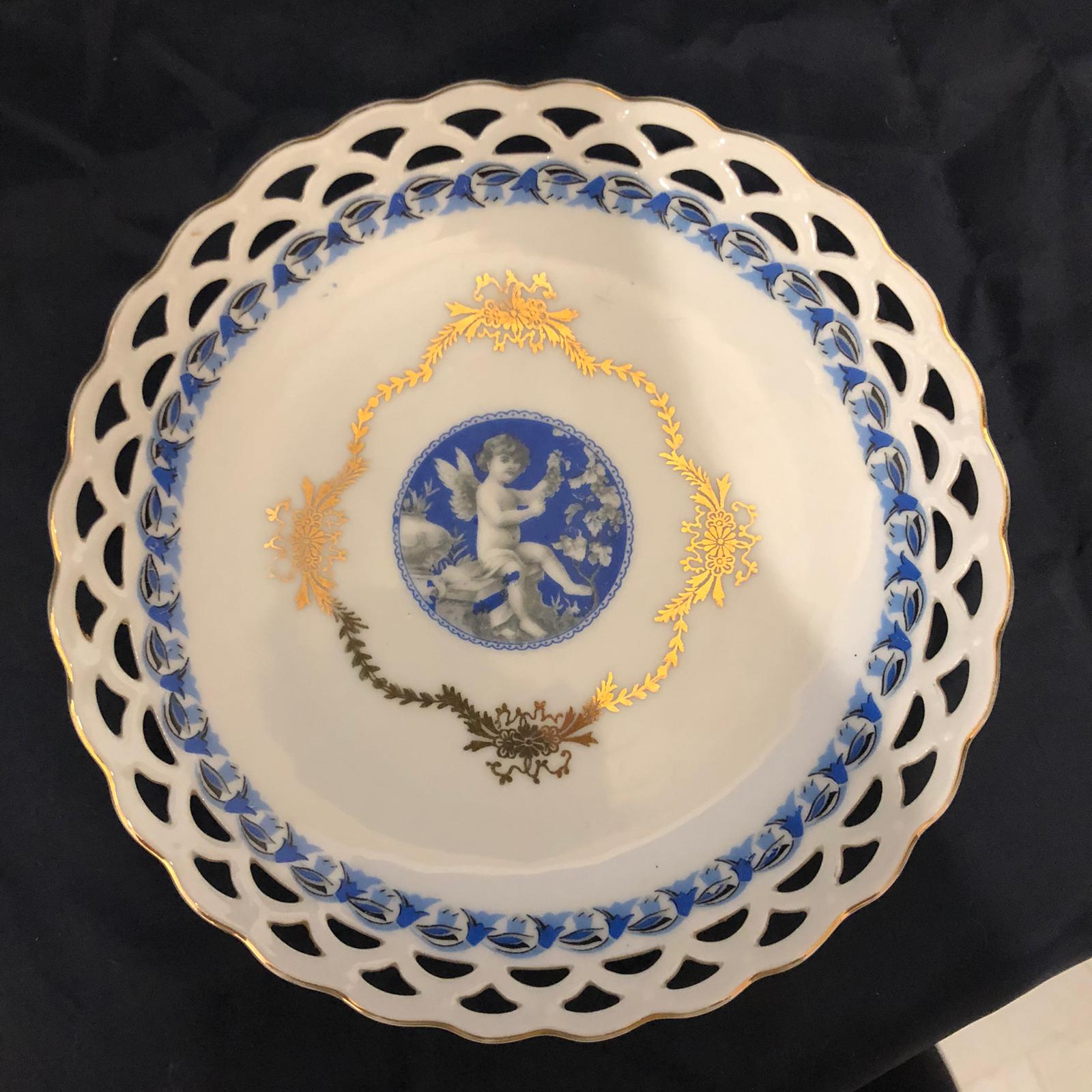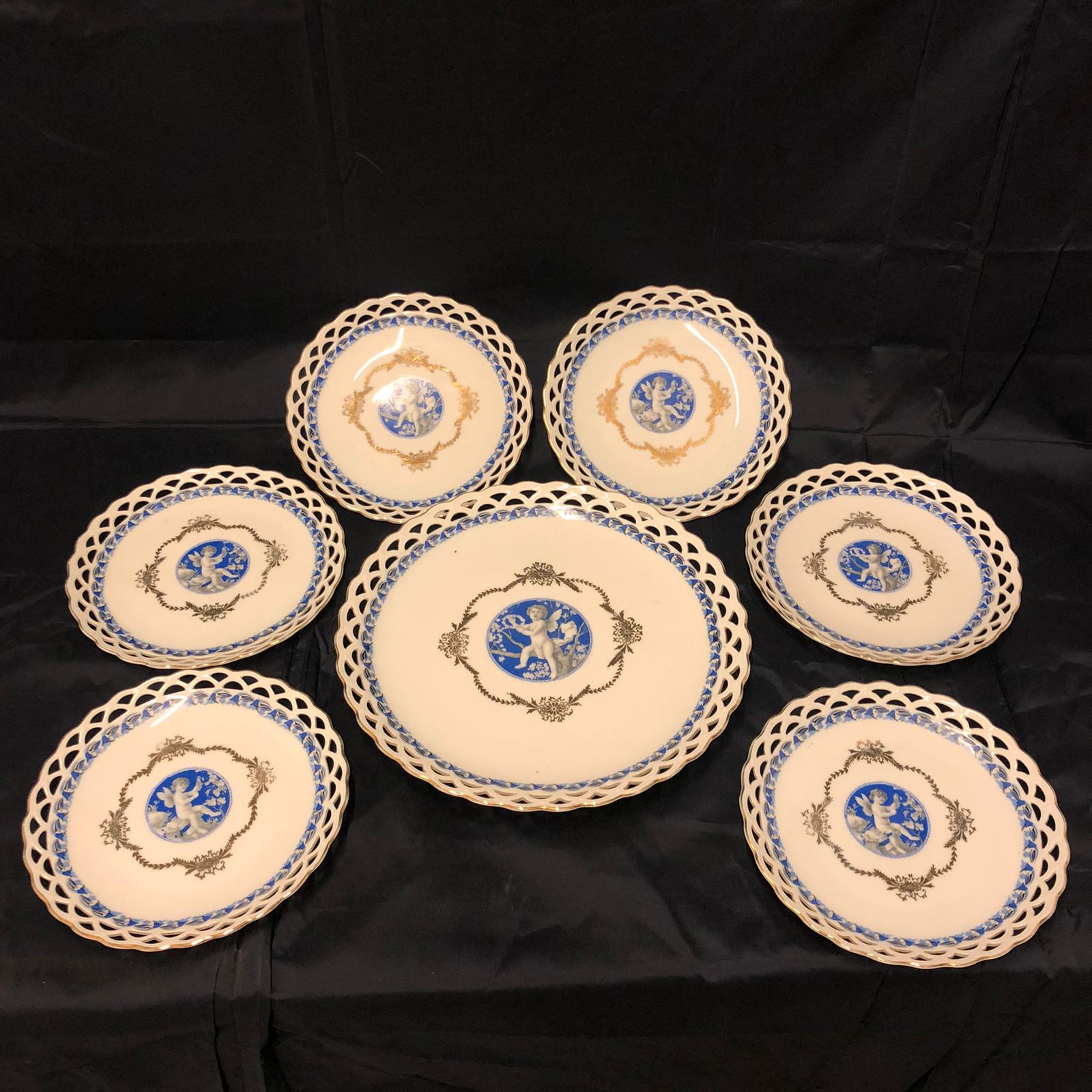 Set da dolce in porcellana traforata e smaltata c/bordi dorati. Al centro presenta un medaglione raffigurante un angelo incorniciato c/decorazioni in oro.