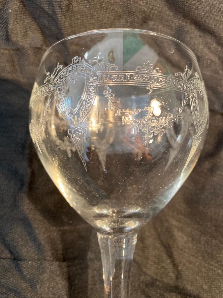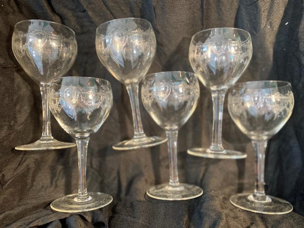 Bellissimo set di sei bicchieri in vetro in stile liberty con incisioni.