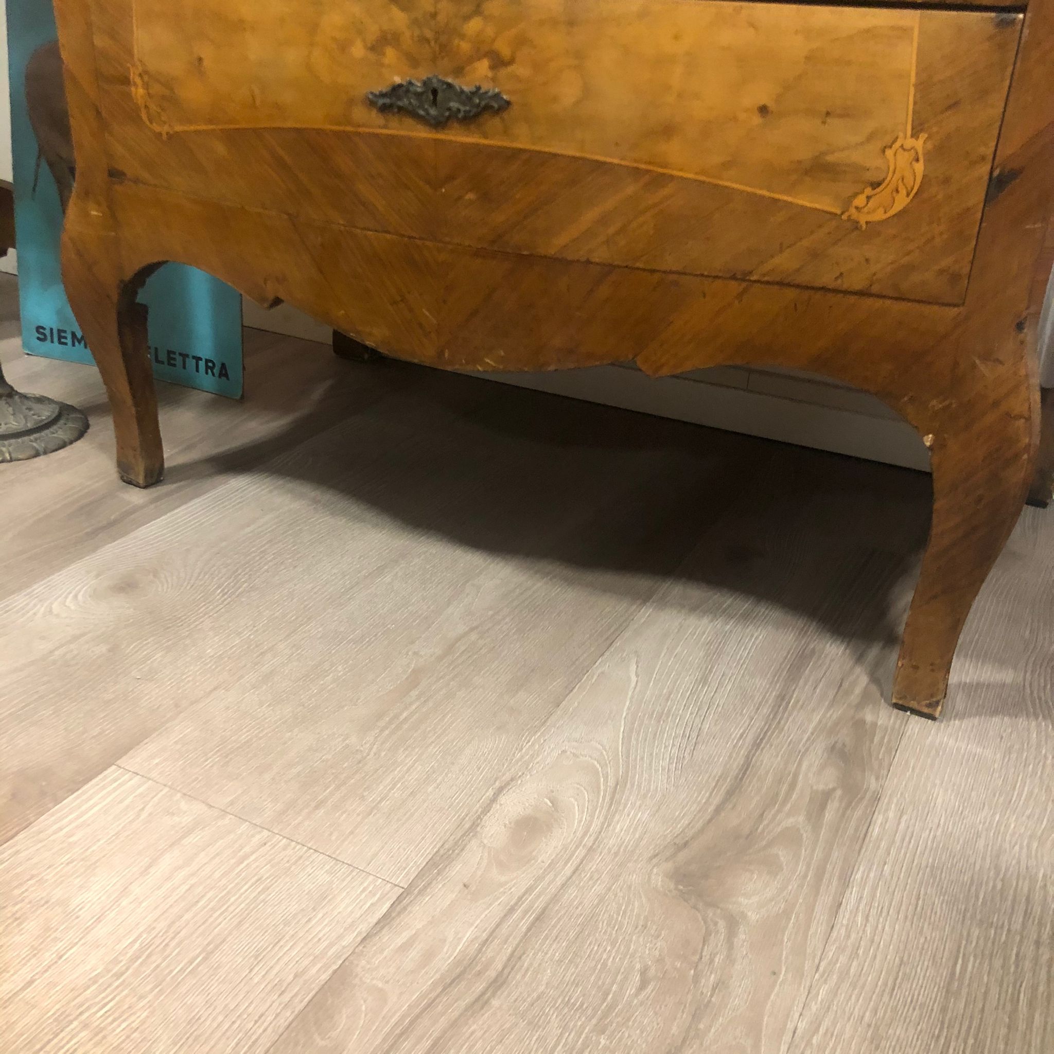 Ferramenta originale intarsiato sul fronte dei cassetti e nei lati con legni di pregio quali: noce, acero, piuma di noce e Bois de Rose.
