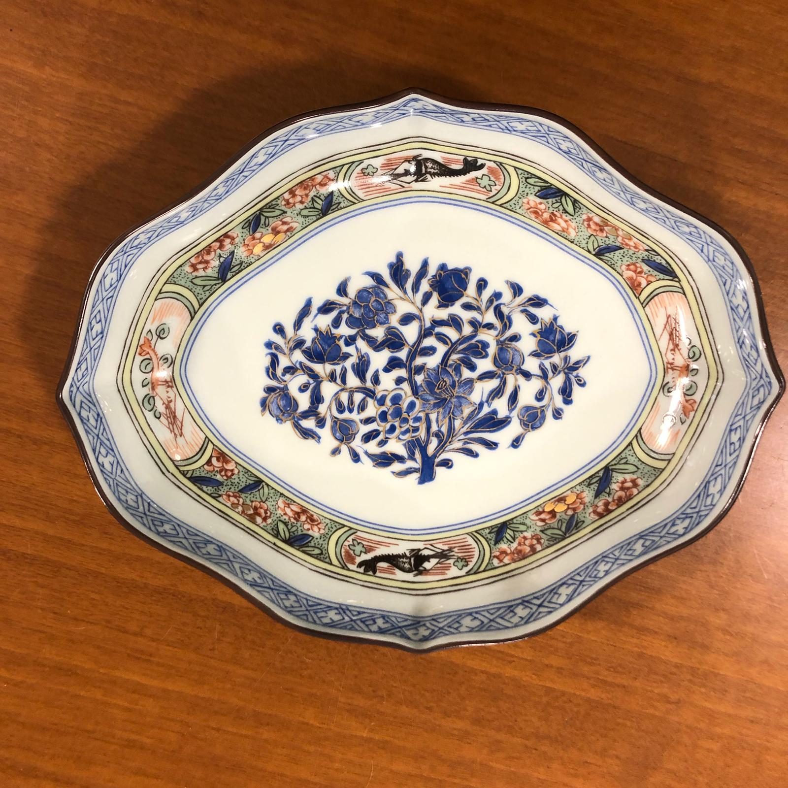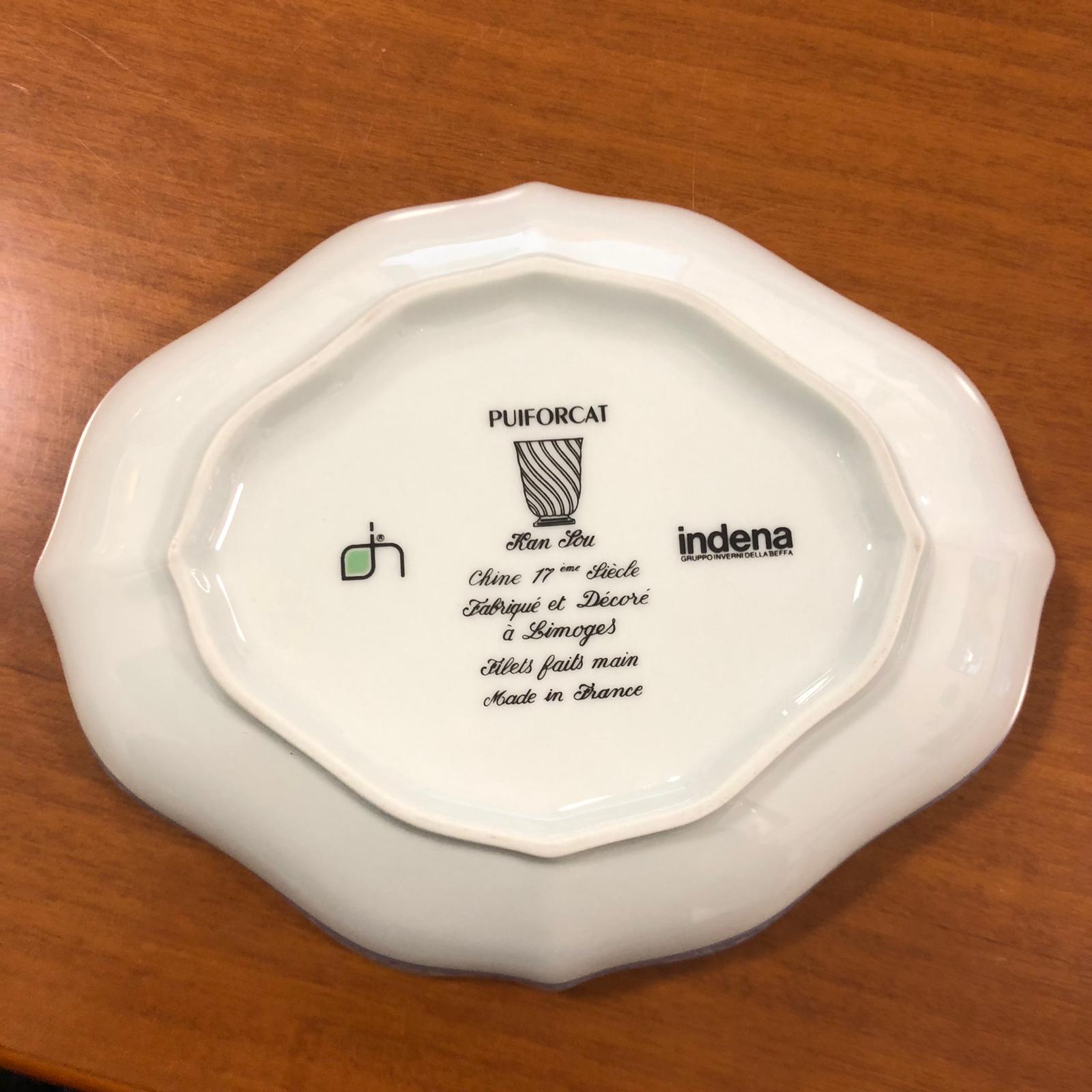 Bellissimo svuotatasche in ceramica Puitforcat Limoges decorato sui bordi c/motivi floreali. Al suo centro una pianta blu c/bordi in oro.