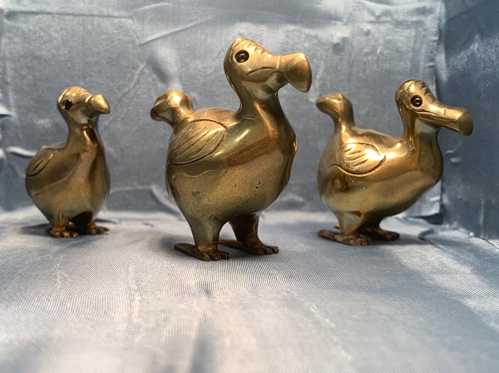 Tre sculture in ottone intagliato che raffigurano tre papere.